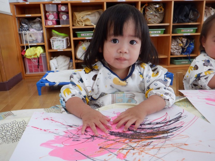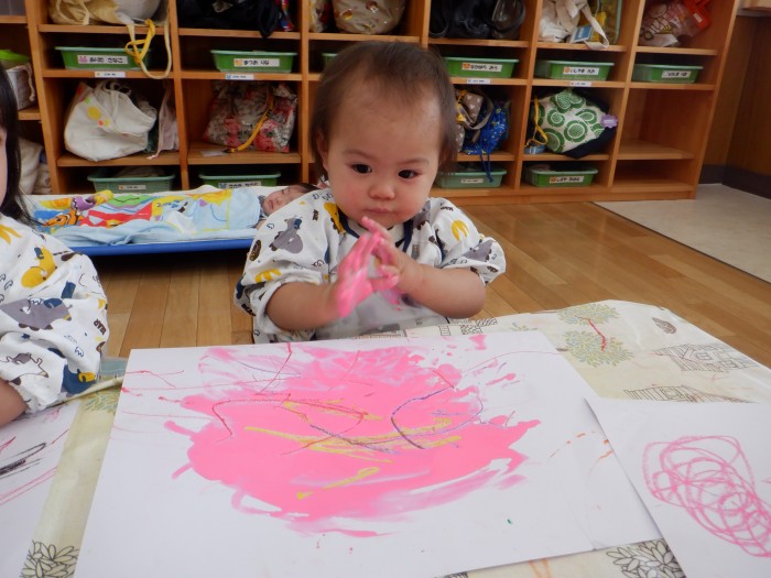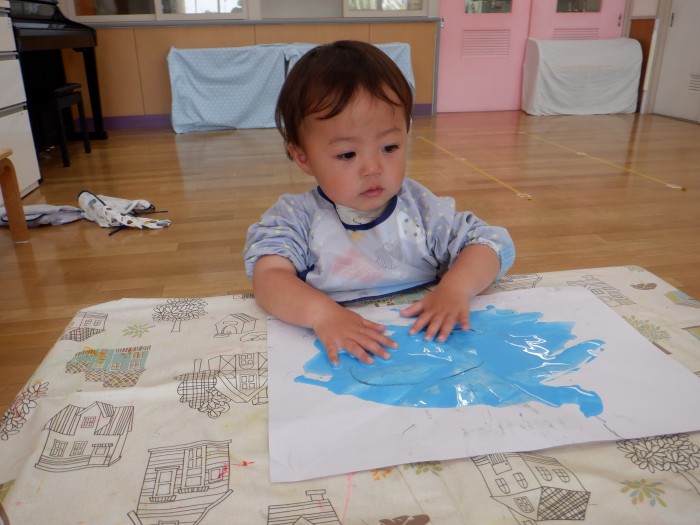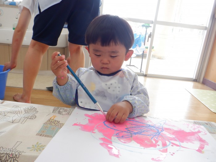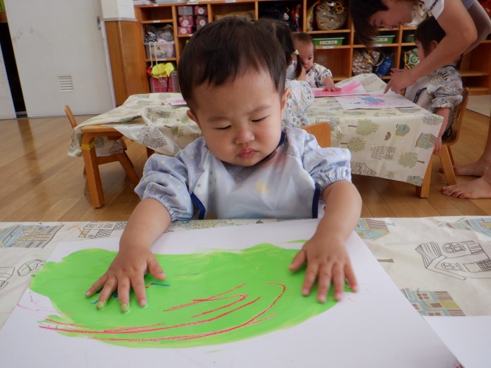 絵の具が好きなたんぽぽぐみさん。両手で画用紙いっぱいに塗っていました(^^)