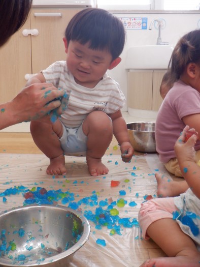 寒天をギューと握ってつぶして楽しんだりボールやカップに入れたり出したりして楽しんだり集中して楽しんでいました。