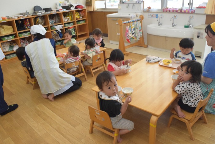 日中たくさん遊んだ後のお給食はみんなもりもり食べています。