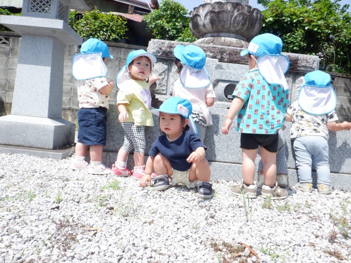 神社に行くと猫の石像を触ったり、石を拾ったり遊んでから園へ帰りました。