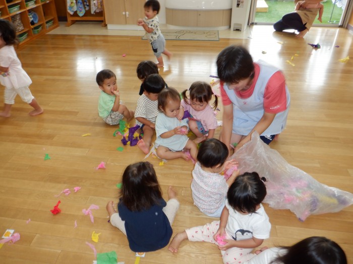 お花紙を破いて遊びました。