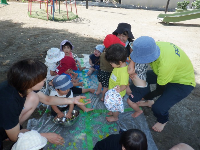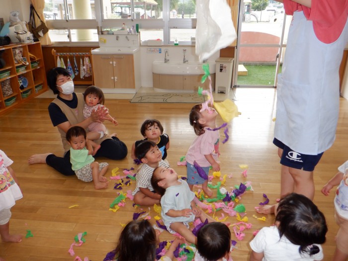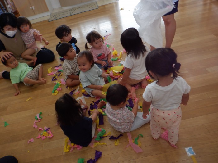 自分で舞い上げてみたり、お友達と色を交換してみたりお花紙に大注目のたんぽぽ組です!