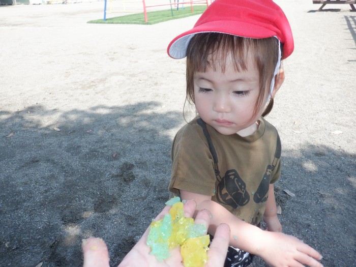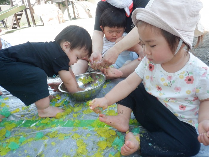 ゼラチンで感触遊びをしました。