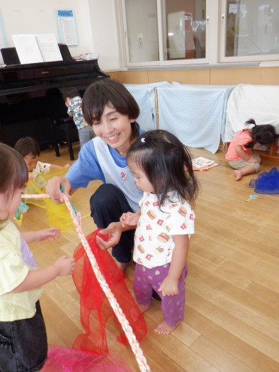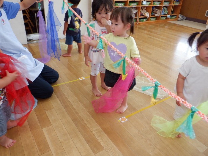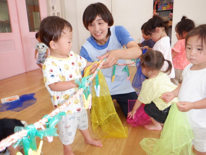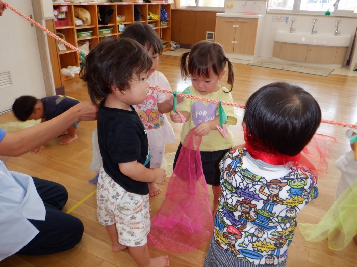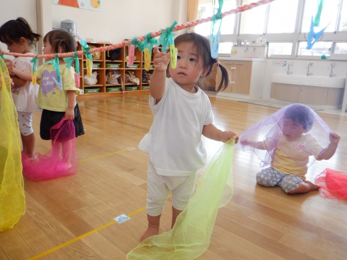 洗濯ばさみとゴースを使って洗濯ごっこをしました。