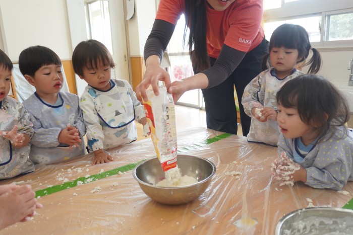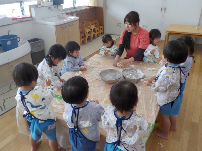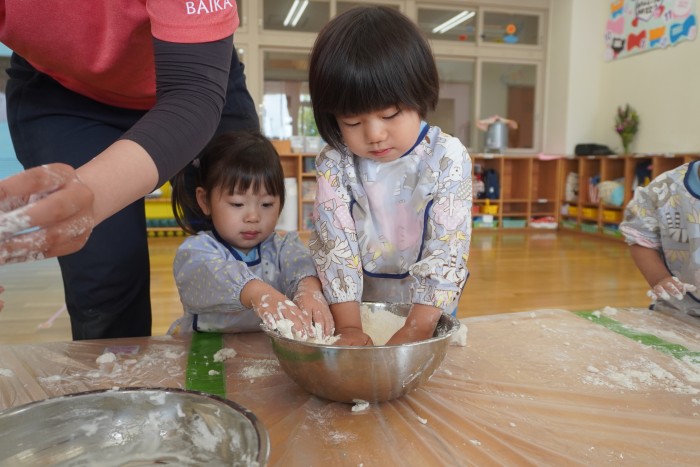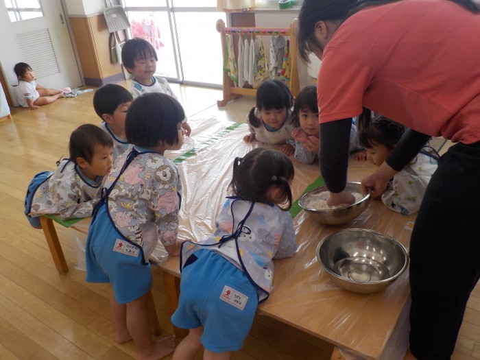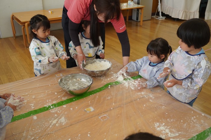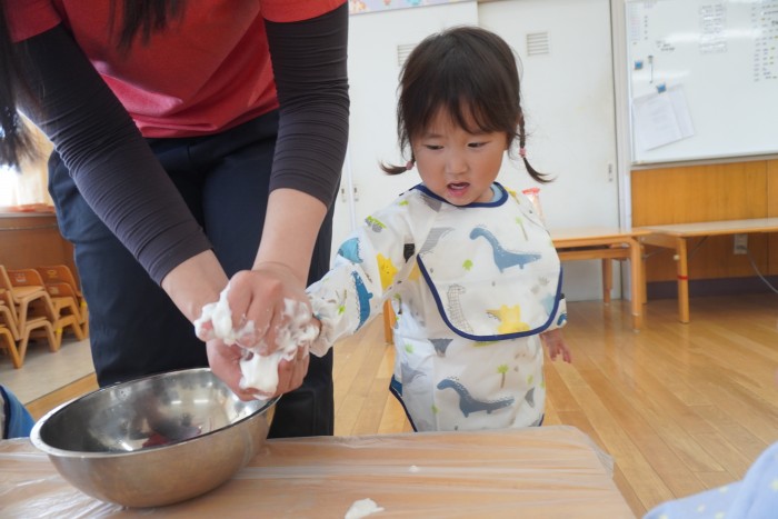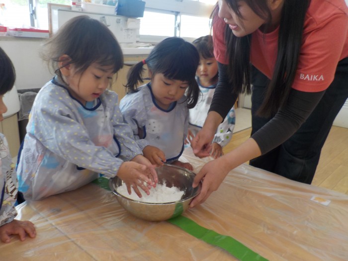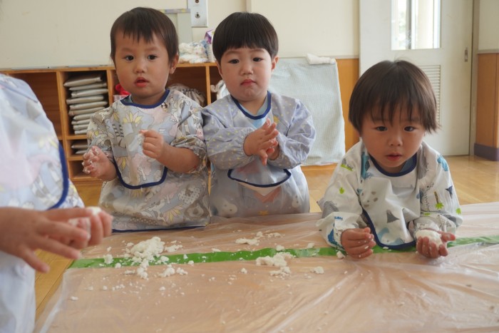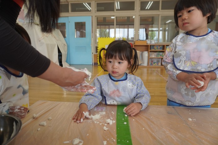 「いいにおいがするね」とお話をしながら、こねたりまるめたりして、楽しんで触っていました。