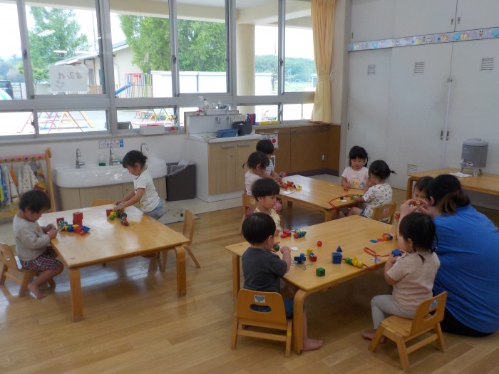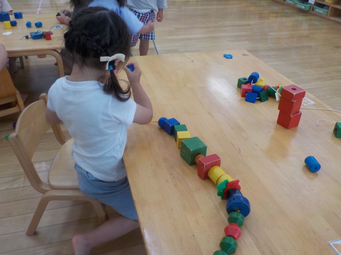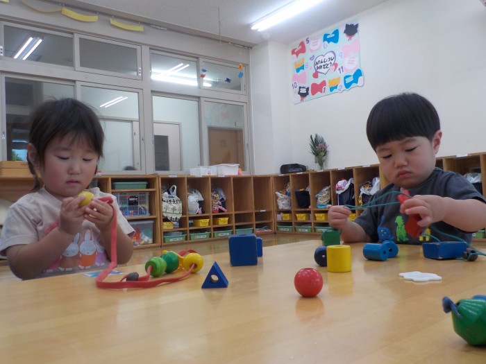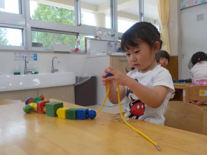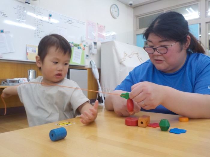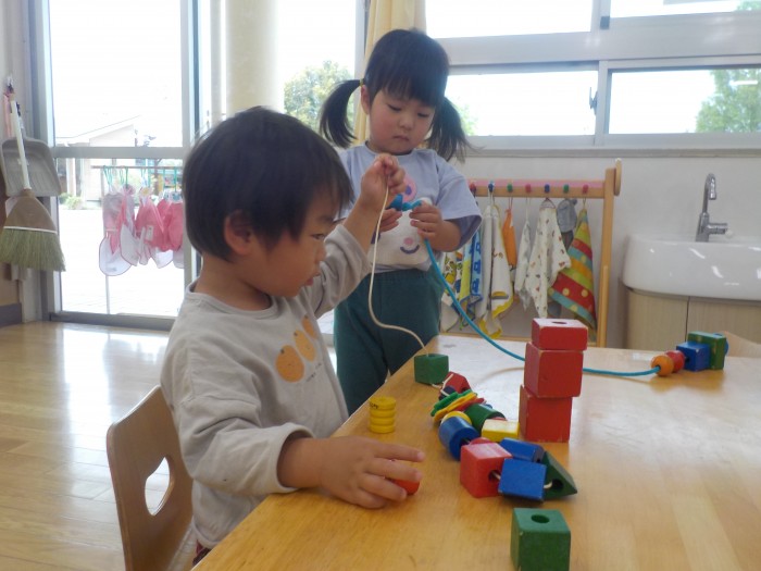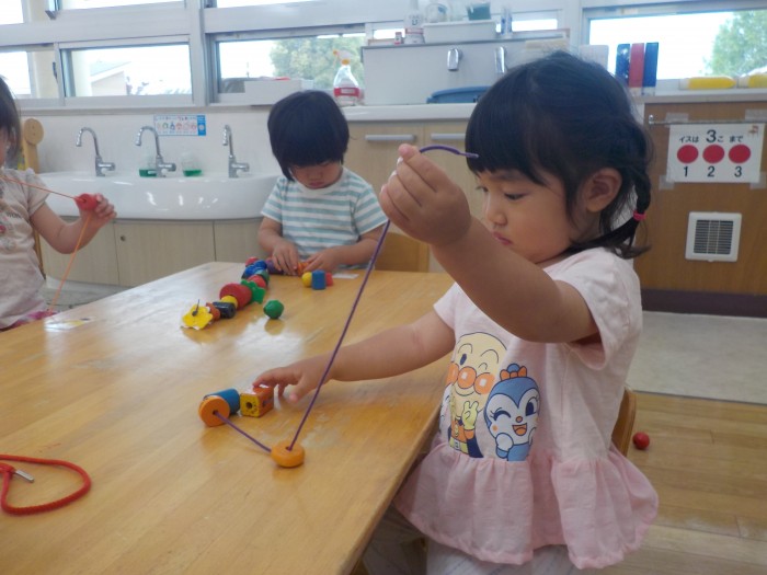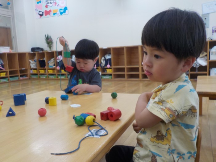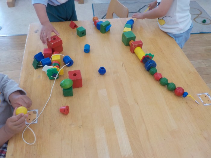 ですが、お友だちができたのを見たり、先生と一緒に紐を通すことができると「あれ、楽しいぞ?」という気持ちの変化が目に見えてわかるほどに、子ども達の取り組む表情が変わり、夢中で真剣に紐通しで遊んでいました。