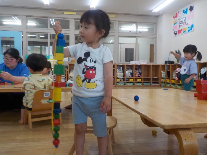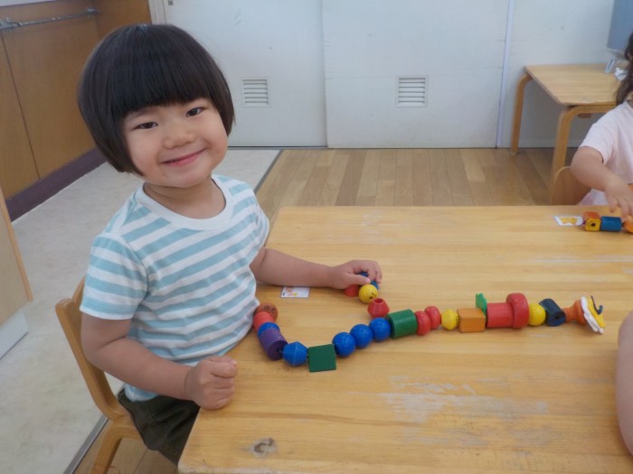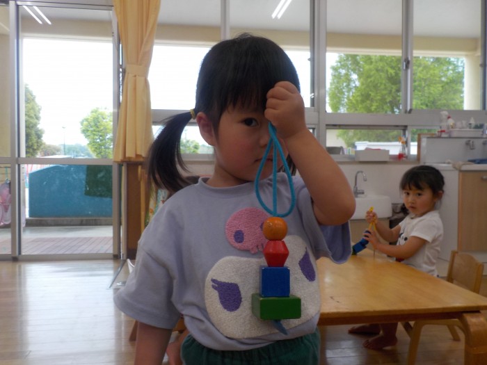 紐の余りが無くなり、端から端までめいっぱい積み木を通すことができると、誇らしげに「みてー!」と見せに来てくれました。