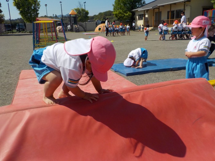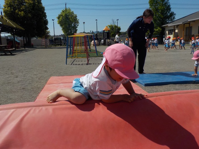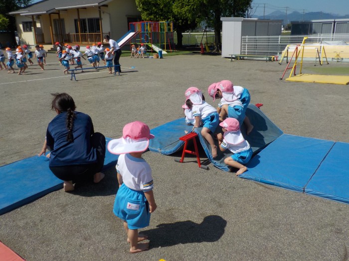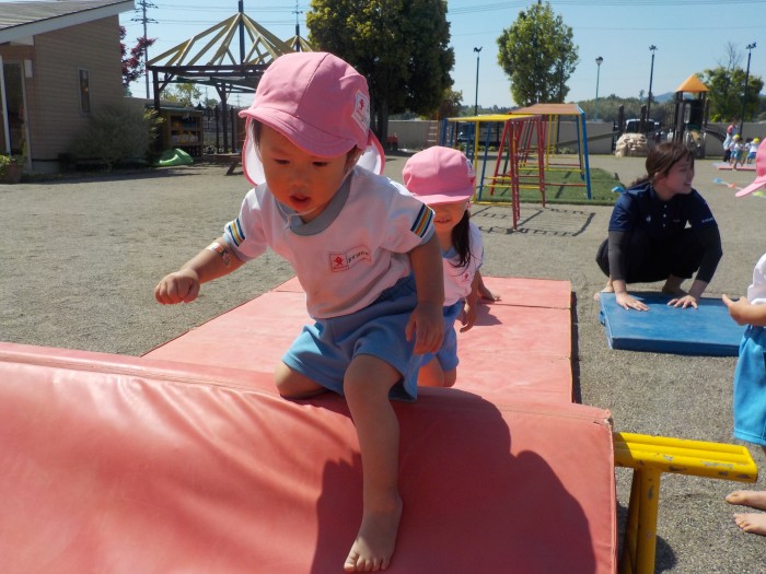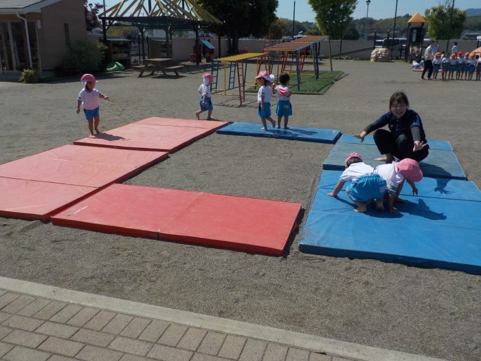 朝の運動遊びでは、くまさん歩き(前・後ろ・横)を頑張っています。手と足をしっかりついて進んだり、平均台で出来たお山を乗り越えたり、毎日楽しんでたくさん身体を動かしています。