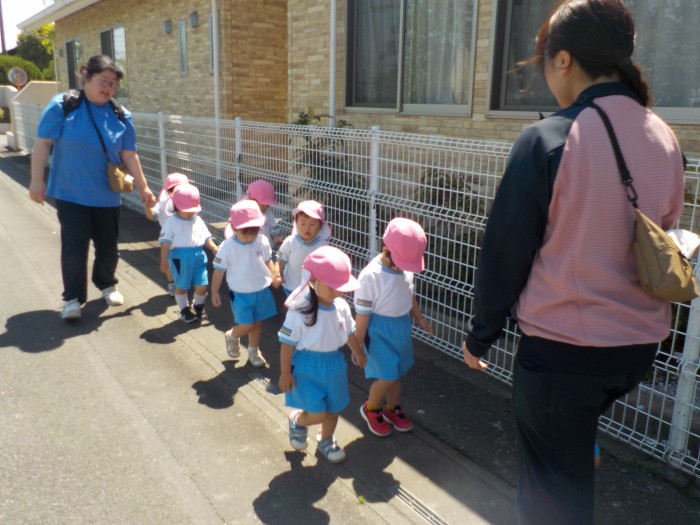 お友達と手を繋ぐことがとても嬉しかったようで、にこにこで「楽しいね!」「みてちょうちょ!」など、たくさんお話をしながらお散歩を楽しみました。