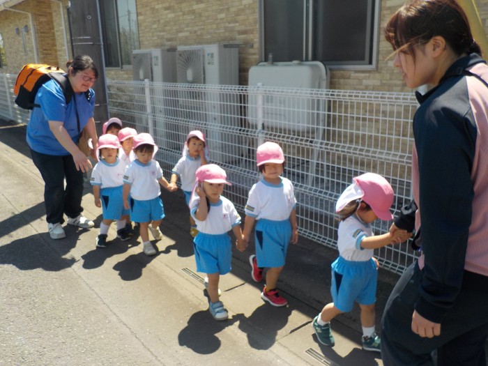 今週の園外散歩は、はじめてお散歩ロープではなく、お友達と手を繋いで行きました。