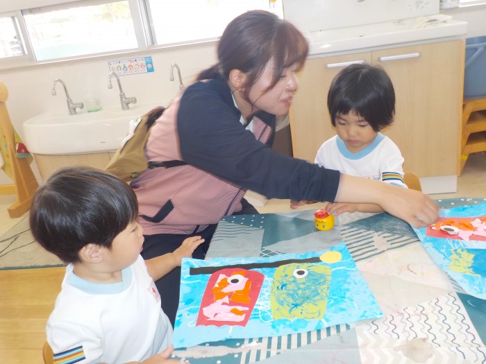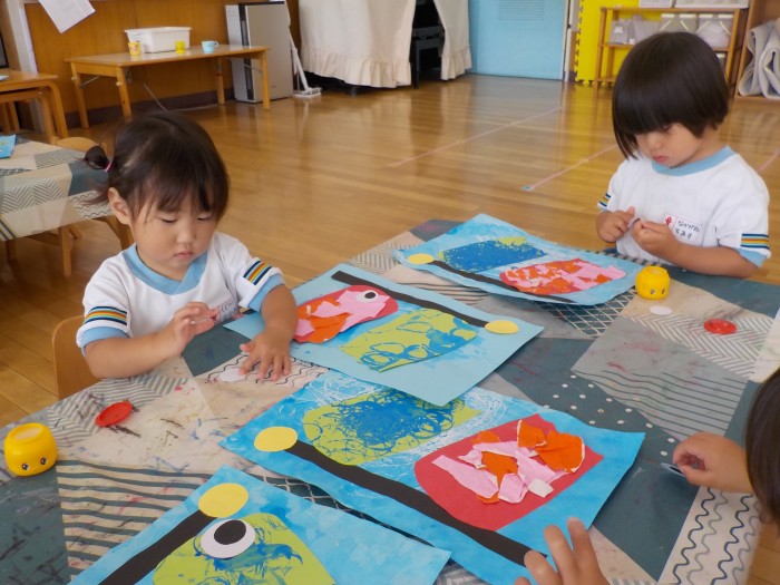 5月の製作活動で、こいのぼりの目をのりで貼りつけました。