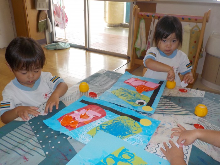 思い思いに目やタイヤを選んで貼り付け、完成すると、とっても満足そうに「できたー!!」と言いながら掲げたり見せたりしてくれました。