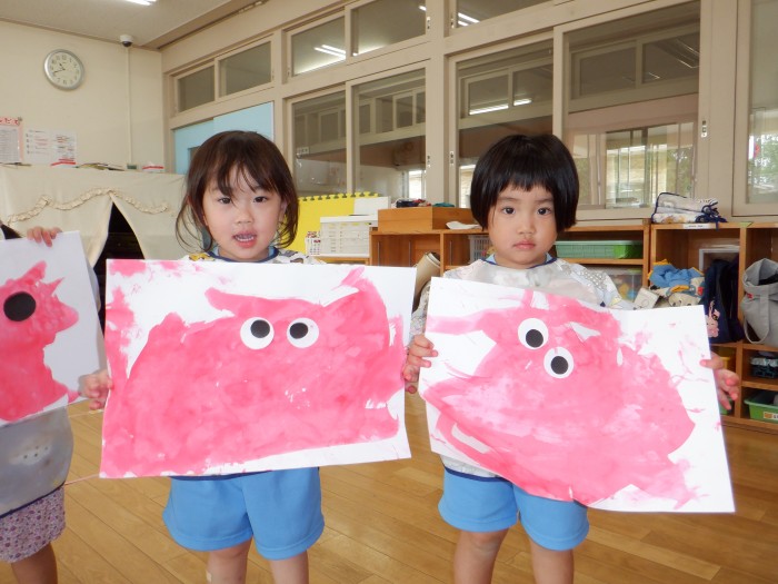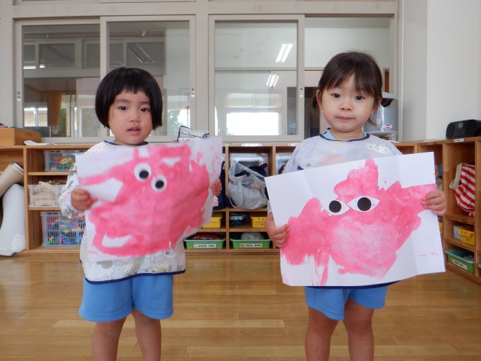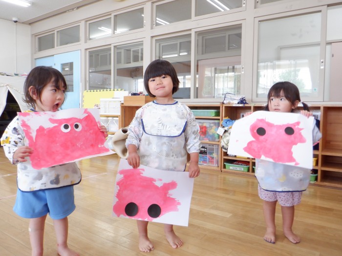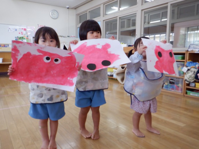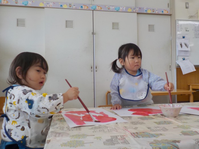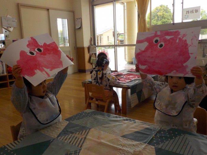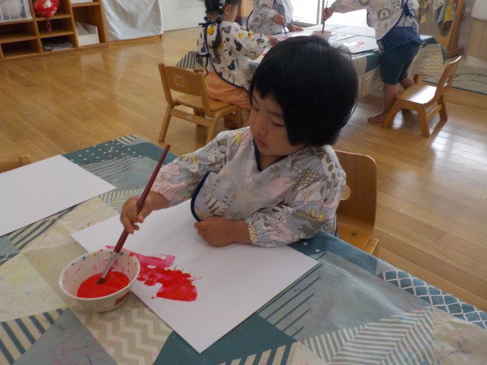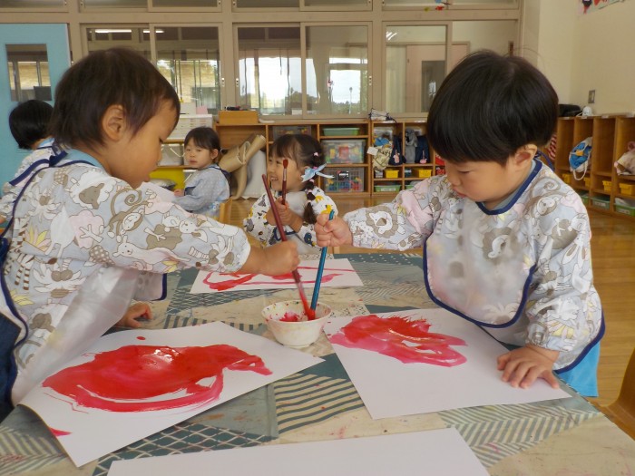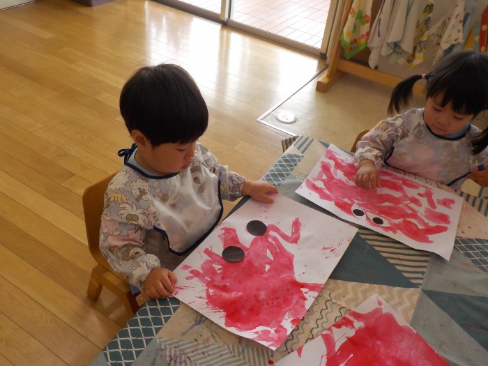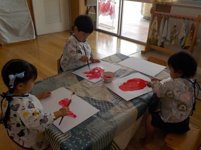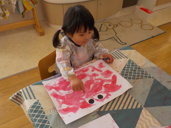 いつも、黄色の絵の具でお絵描きをしていたので、赤の絵の具を見ると「あかだー!」「あか!」と、いつもと違う色に気づき「いつもと違うぞ!」という声が今にも聞こえてきそうなほど、嬉しそうな笑顔を浮かべていました。