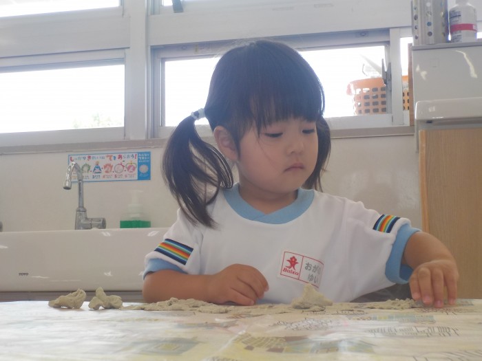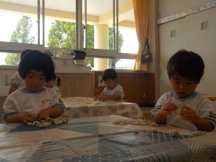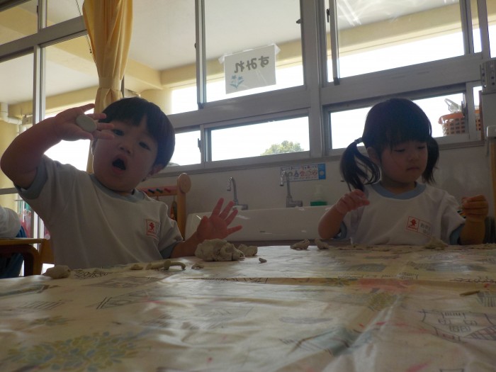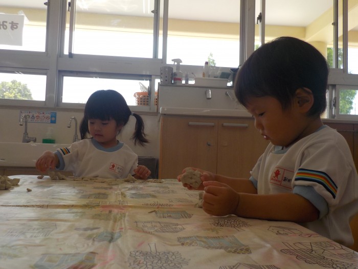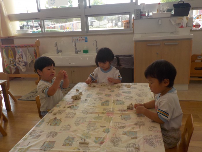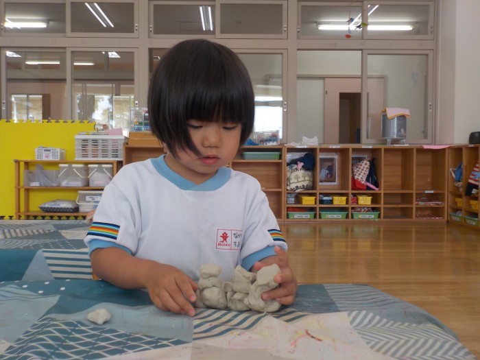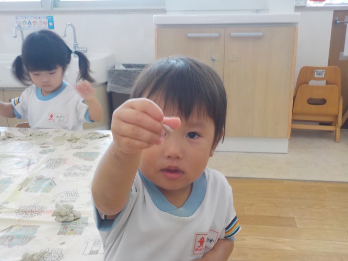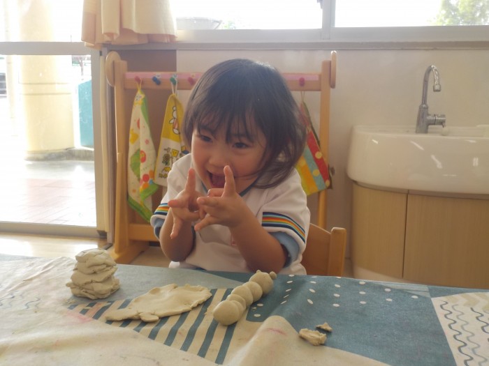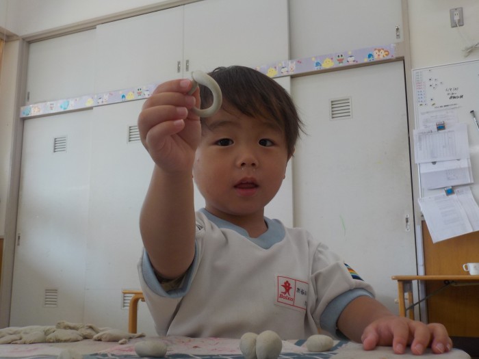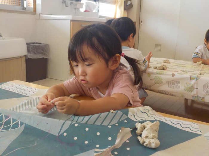 手のひらをすり合わせて細長くのばしてできたヘビの頭とおしりをくっつけてドーナツを作ったり、粘土を小さくちぎったりして、楽しんで遊びました。