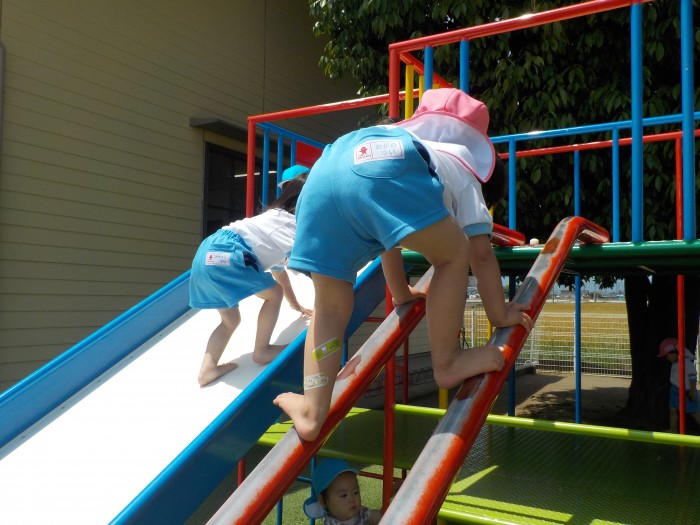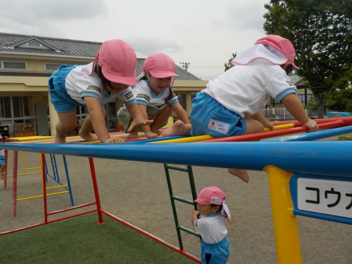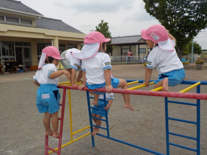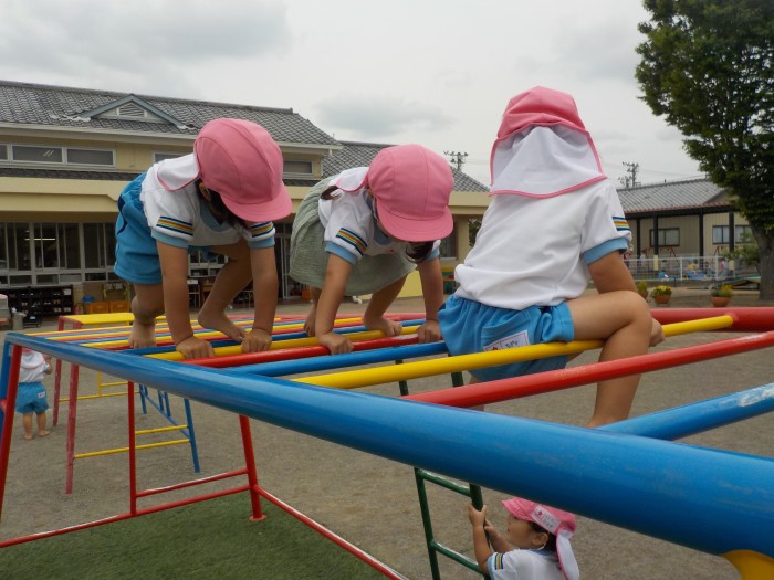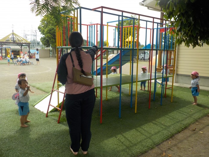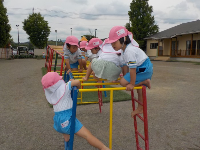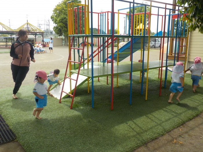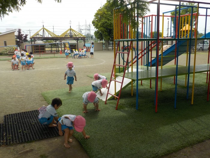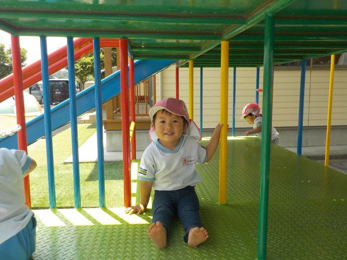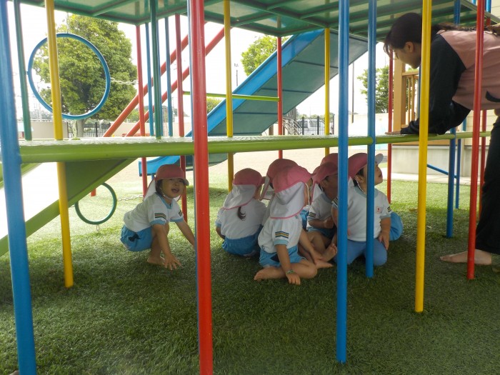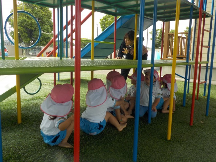 不規則なタイミングで「美味しそうな〇〇の匂いがするなあ!」と先生が言うと、子ども達はそれを聞いてすぐにジャングラミングの1番下に入って隠れました。何度も繰り返し遊んでいるうちに、どんどん子ども達の反応も早くなり、「見つからないから帰っちゃったんだって!よかったね見つからなくて!」と声をかけると「まだ!!」「またくるよ!?」と言って、にこにこで楽しんでいました。
