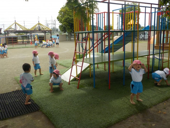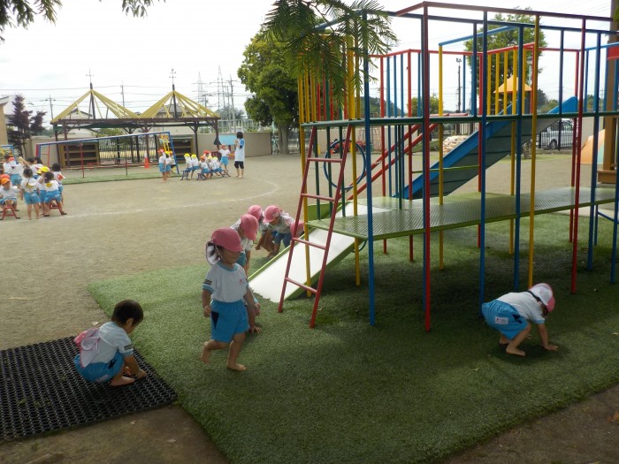 走ったり、うさぎジャンプ・くまさん歩き(前・後ろ)・かえるジャンプ・あひる歩きなど、いろんな動物になりきったりして、たくさんぐるぐると回りました。