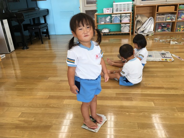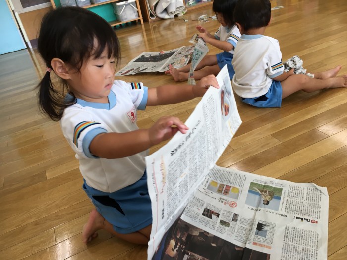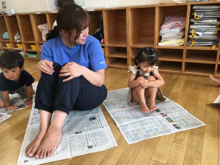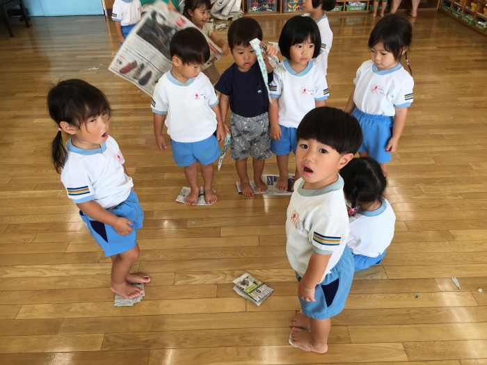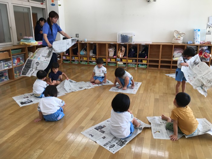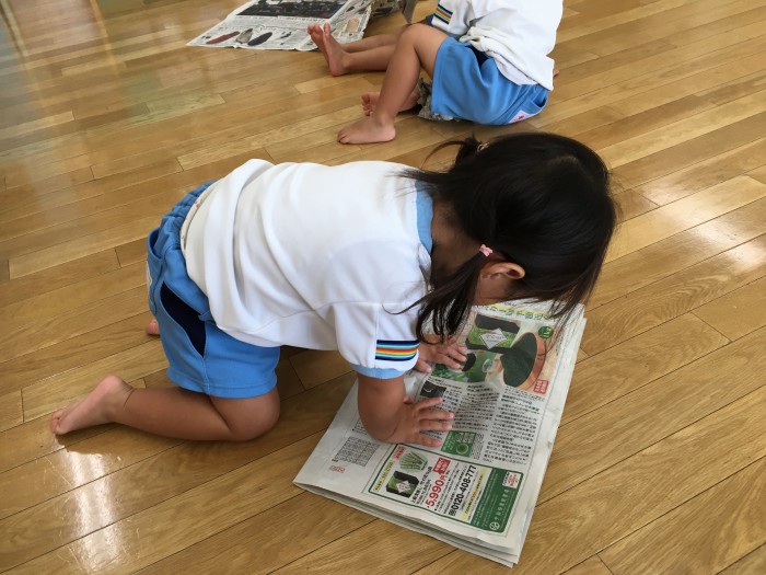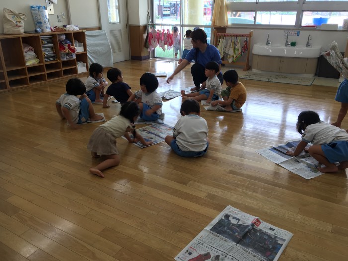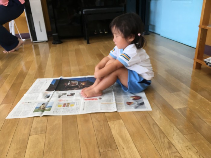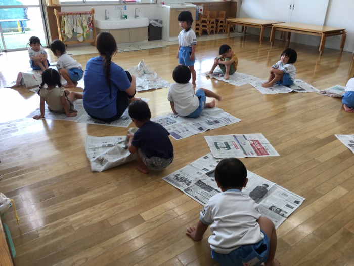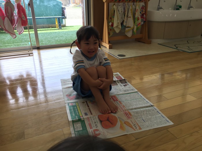 みんな、大きな新聞紙に一生懸命小さくなって座っている姿がとても可愛らしかったです。