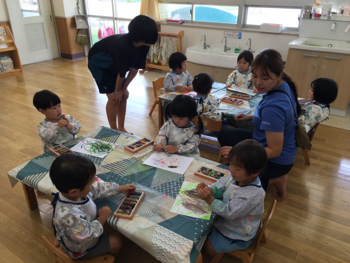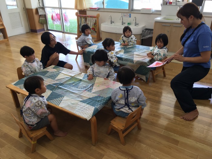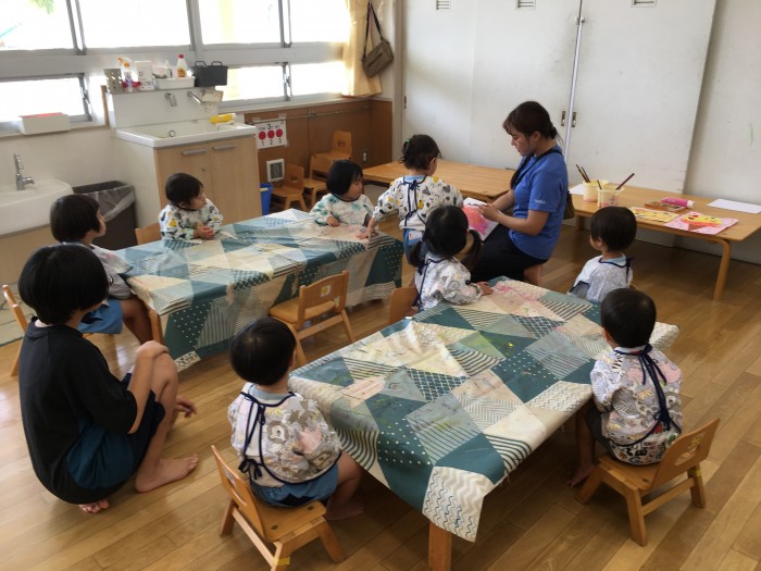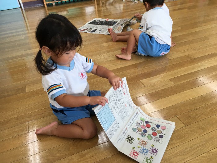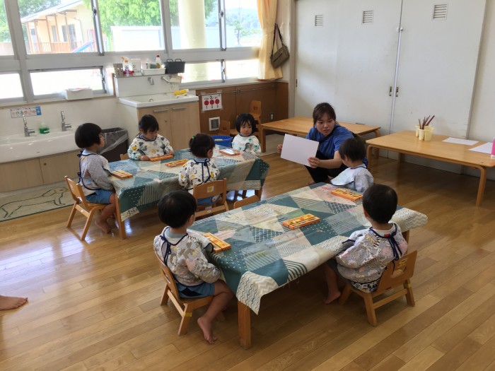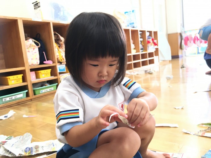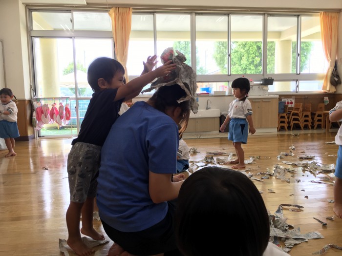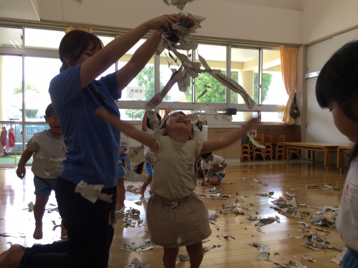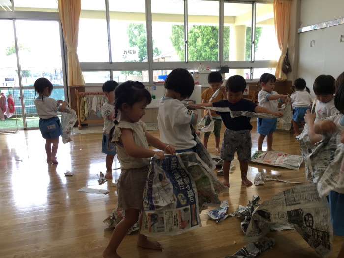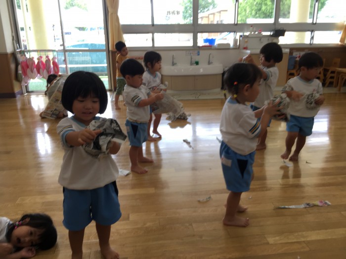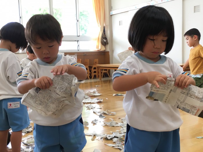みんな、大きな新聞紙に一生懸命小さくなって座っている姿がとても可愛らしかったです。