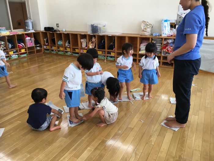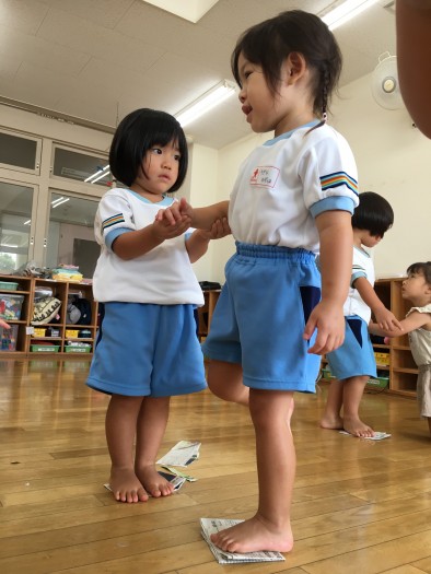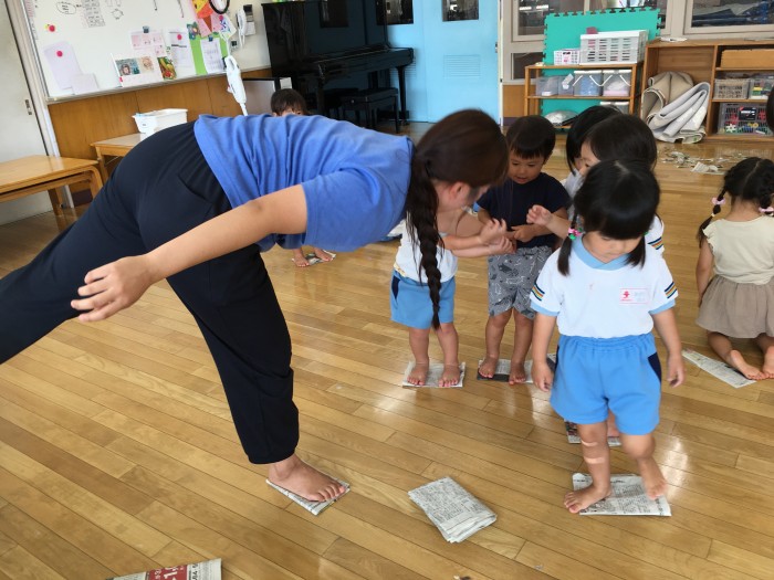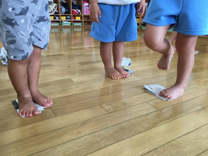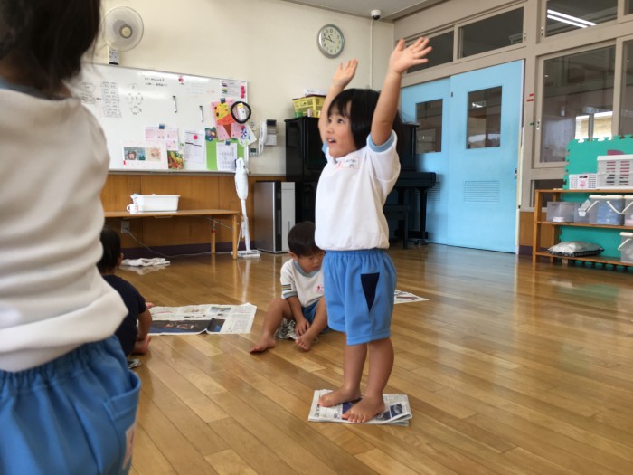 だんだん新聞紙が小さくなってくると、「落ちちゃう~!」とニコニコで片足でバランスをとったりつま先立ちをしたり、子ども達なりに考えて「新聞紙から落ちないように!」と楽しんでいました。