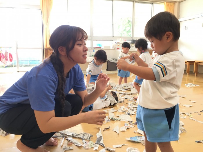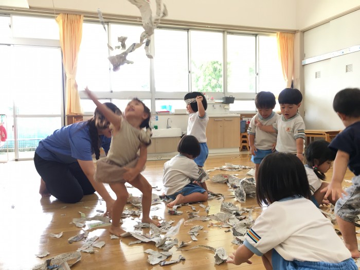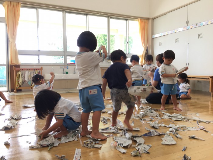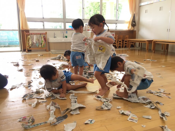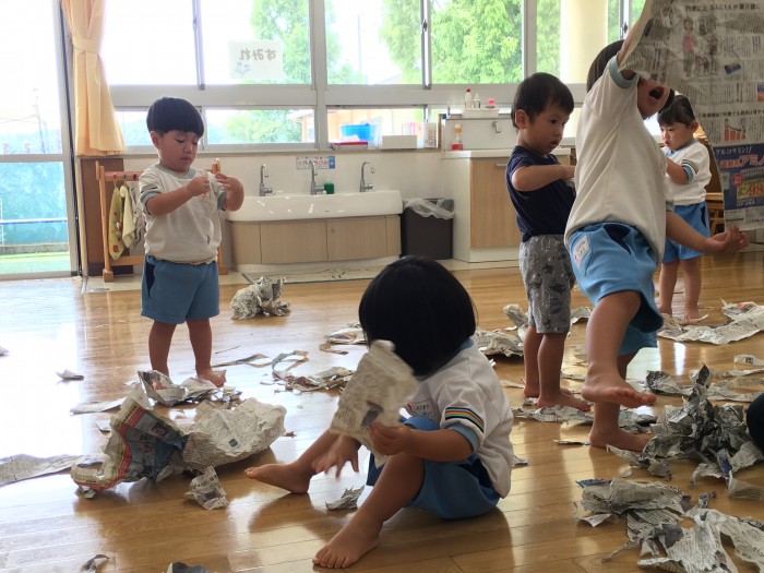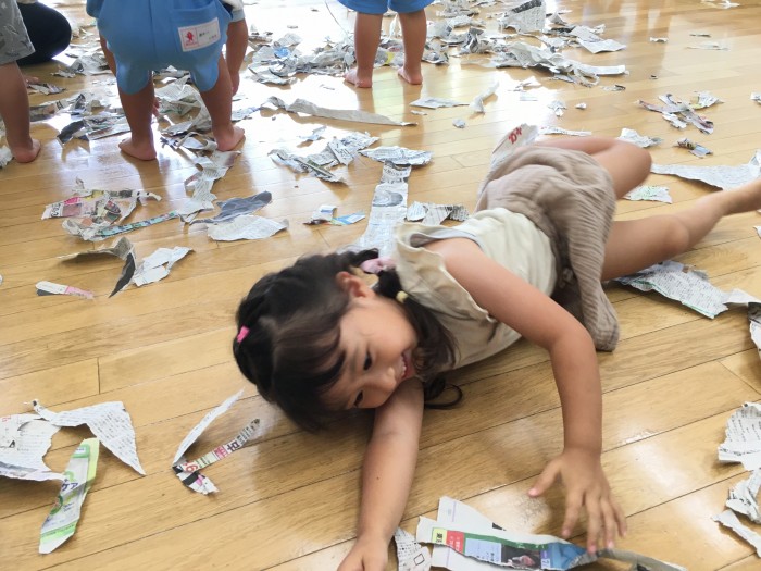 そのあとには、大きな新聞紙をクシュクシュとまるめて小さくしてお団子を作ったり、指先で新聞紙をつまみ、びりびりと破り、それを上に舞わせて新聞紙の雨を降らせたり新聞紙の海を泳いだり、めいっぱい楽しんで遊びました。