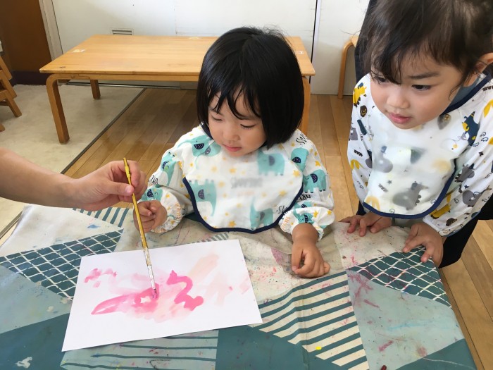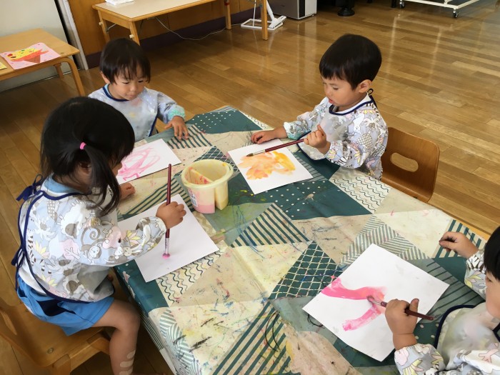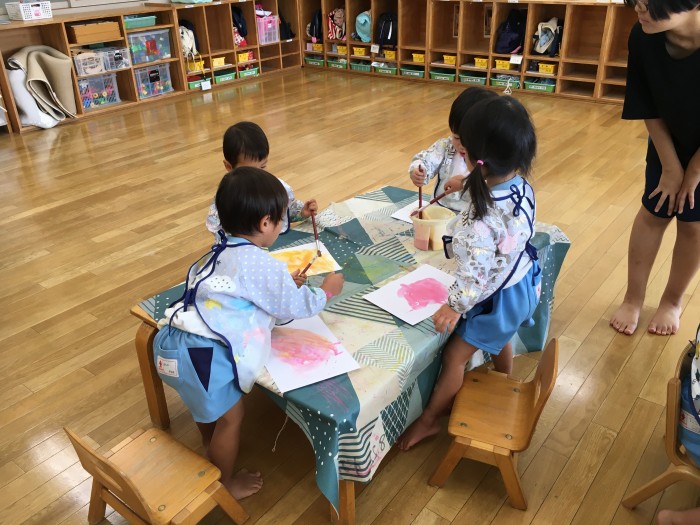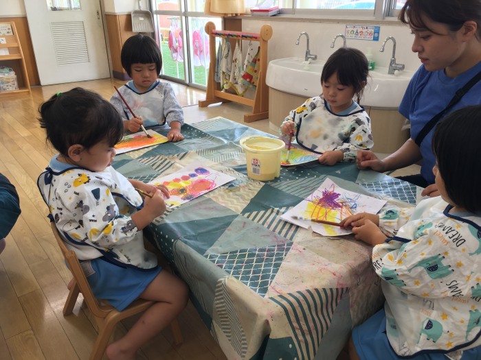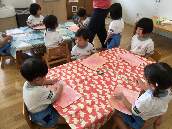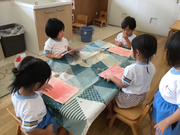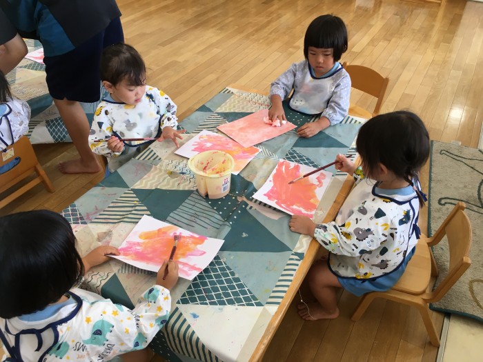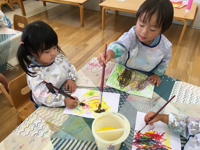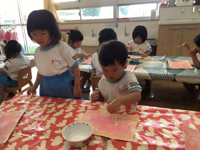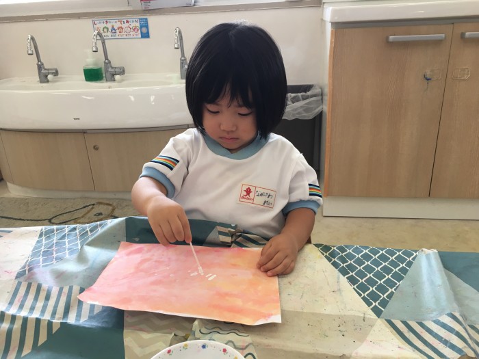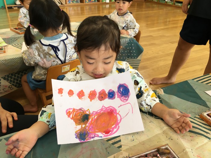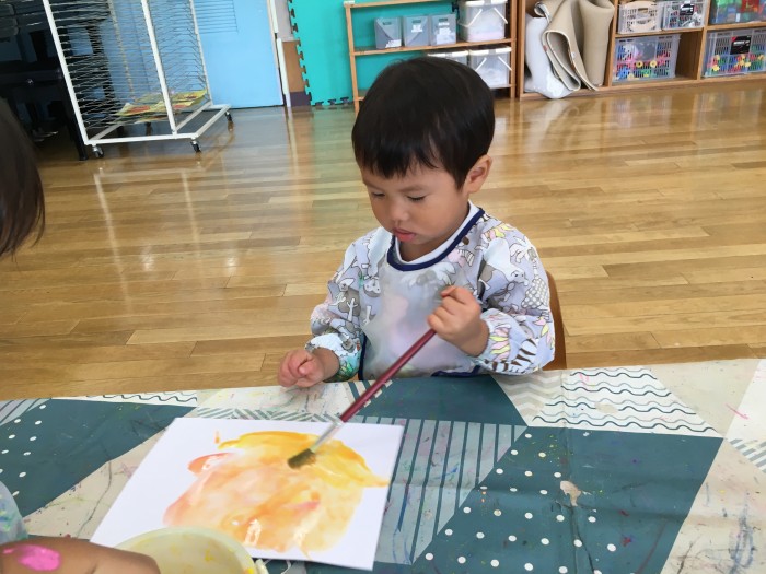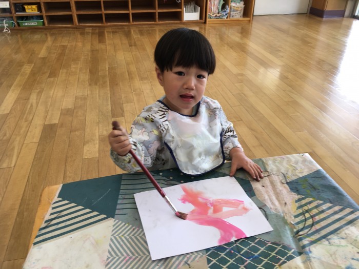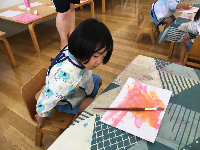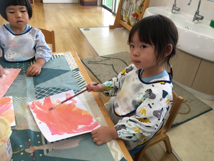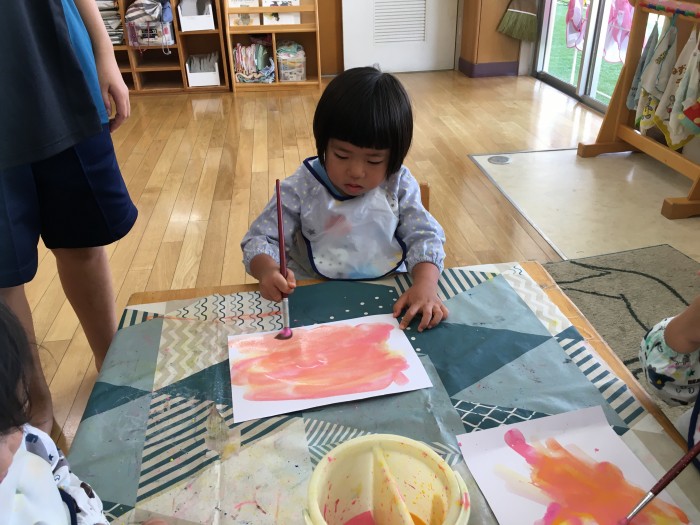 そのあとには、真っ白の画用紙にピンクと黄色の絵の具で好きなだけお絵描きをして、色の混ざりを楽しみました。
