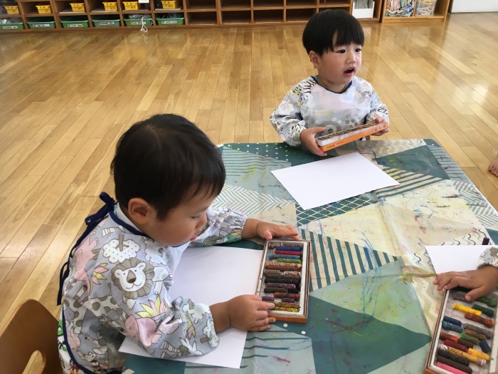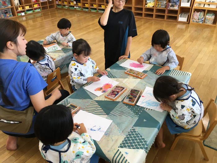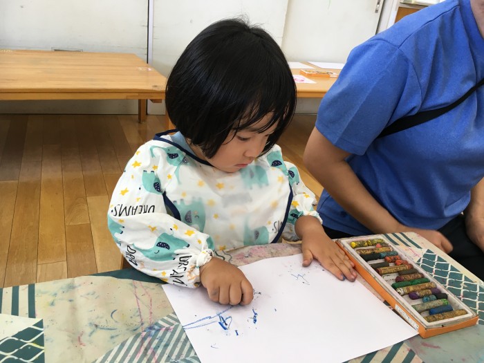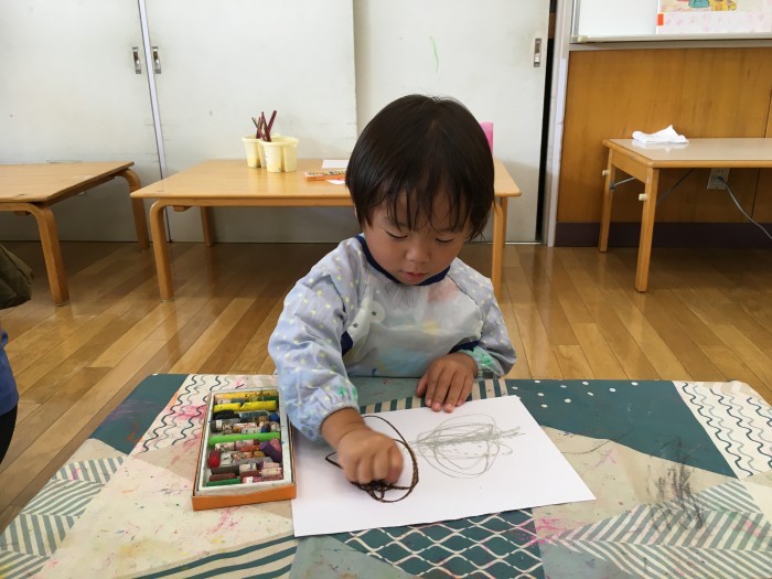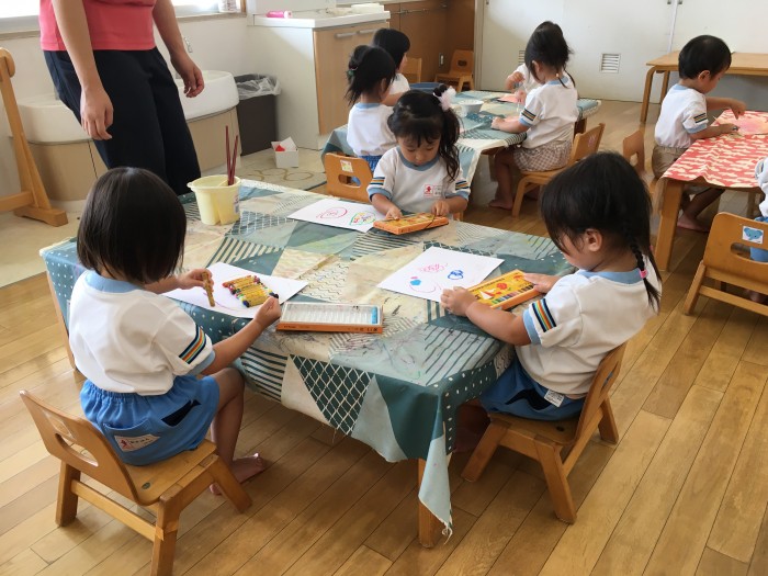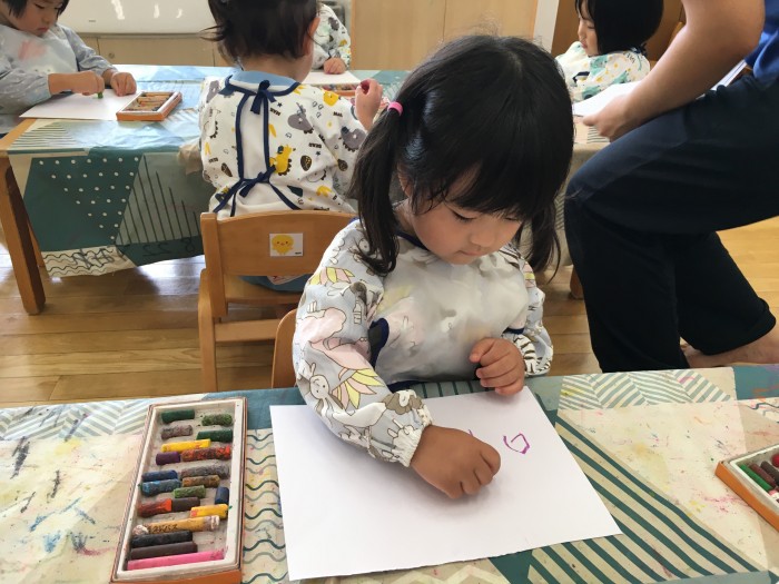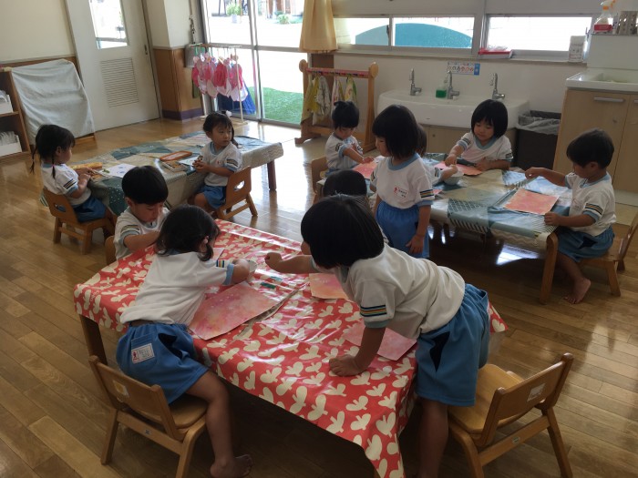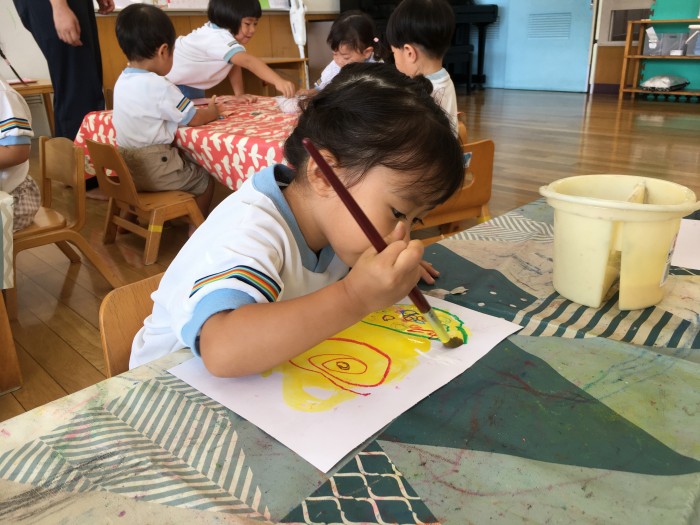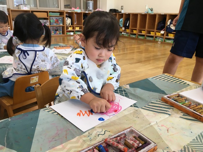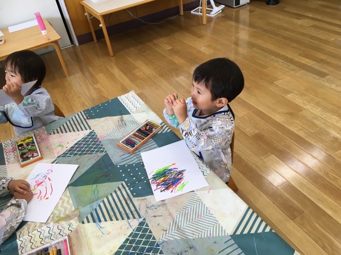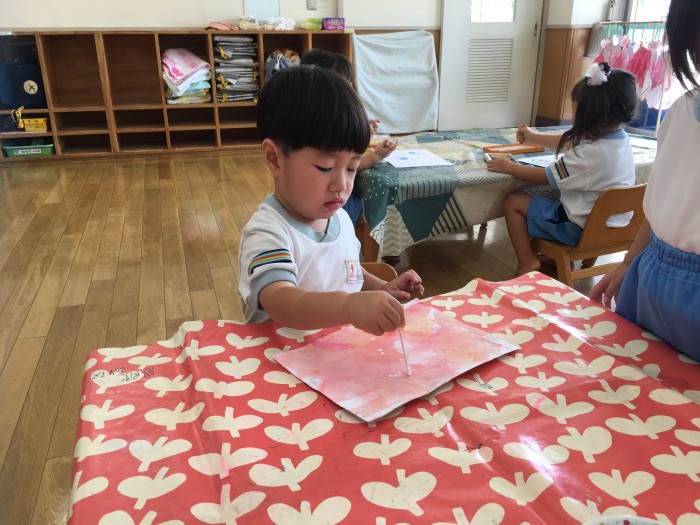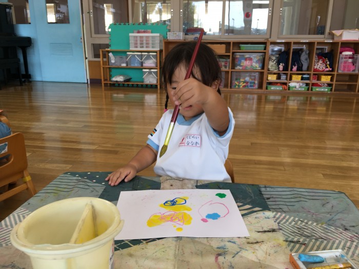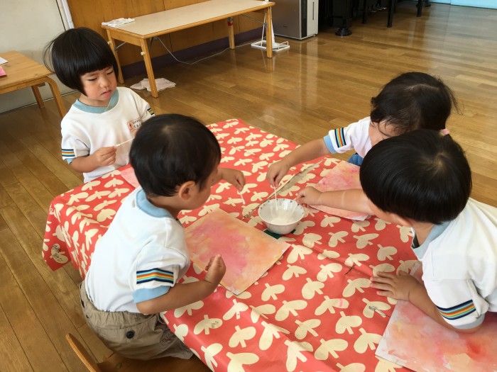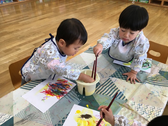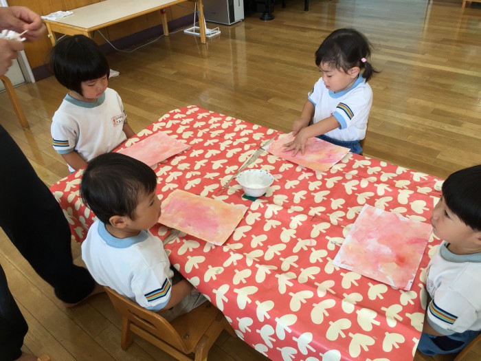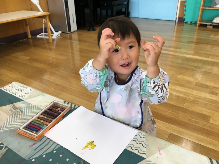 そのあとには、真っ白の画用紙にピンクと黄色の絵の具で好きなだけお絵描きをして、色の混ざりを楽しみました。