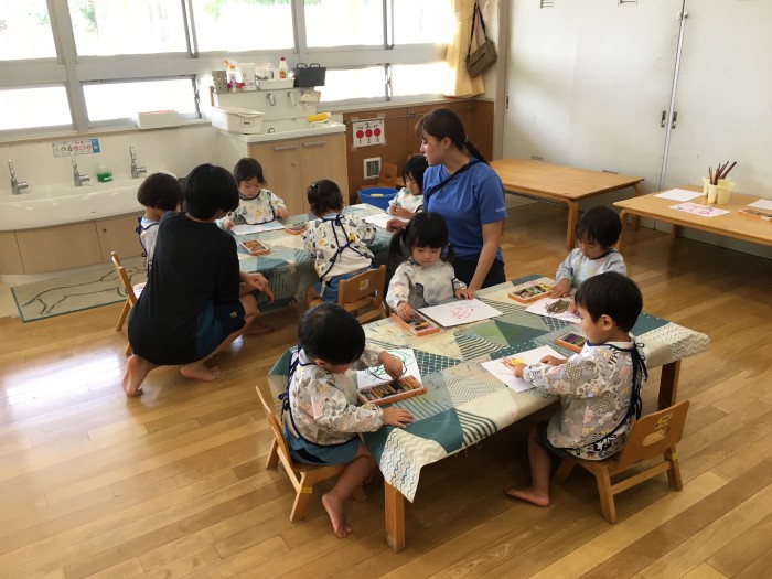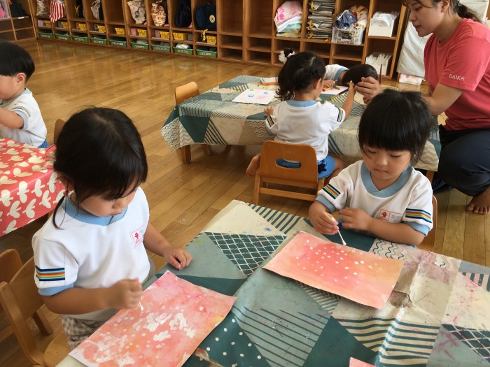 絵の具が乾いてからは、綿棒に白い絵の具をつけて「美味しくなあれ」と魔法をかけながら、たくさんスタンプを楽しみました。