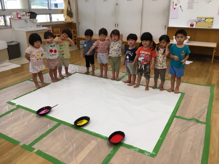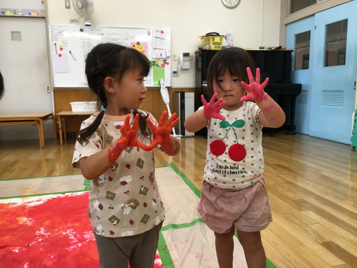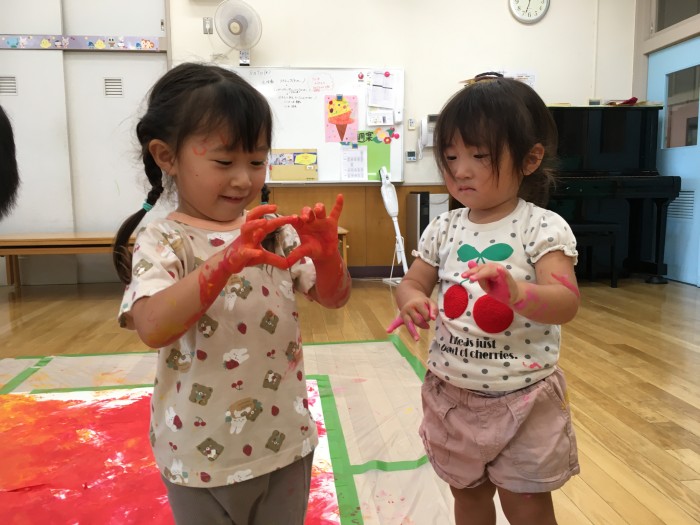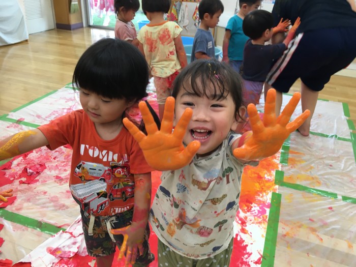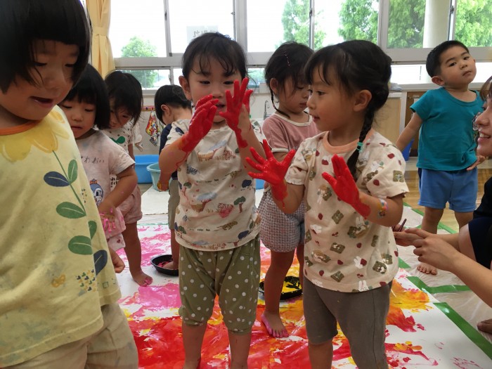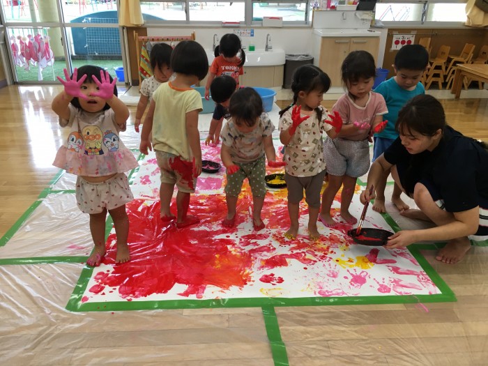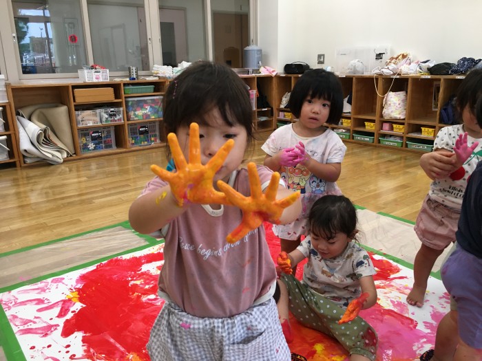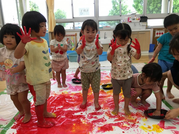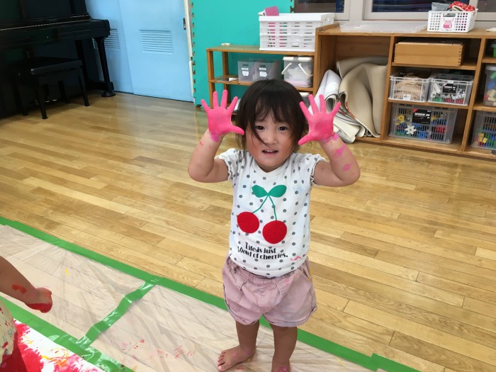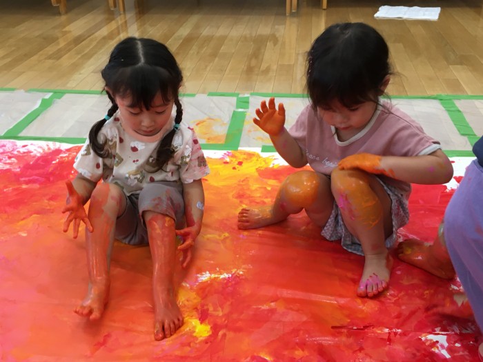 好きな色を自分で選んで手・足に絵の具をつけて楽しくたくさん遊びました。