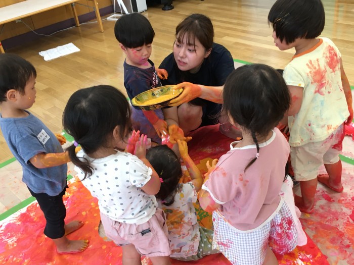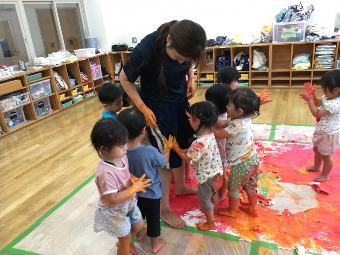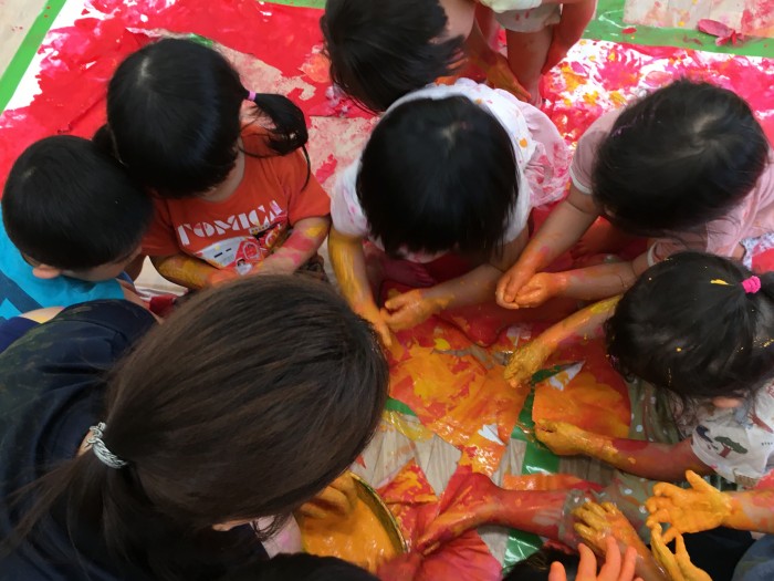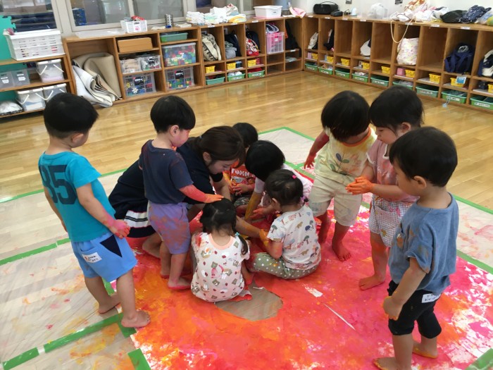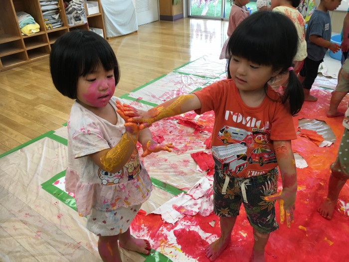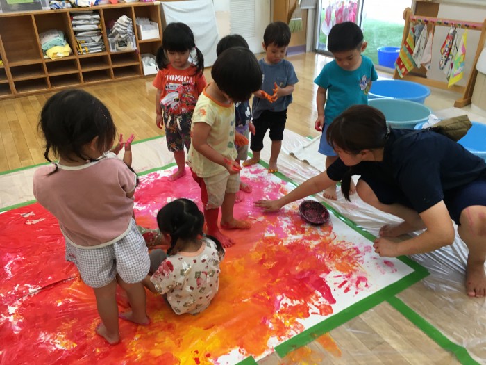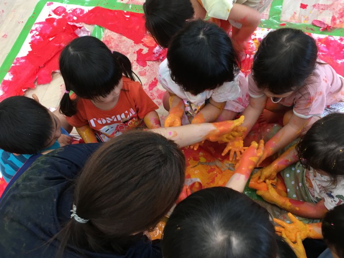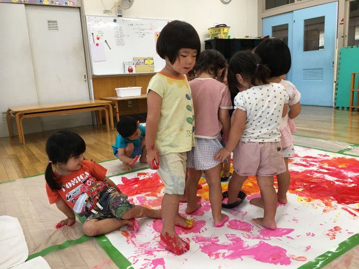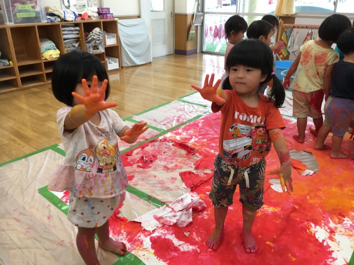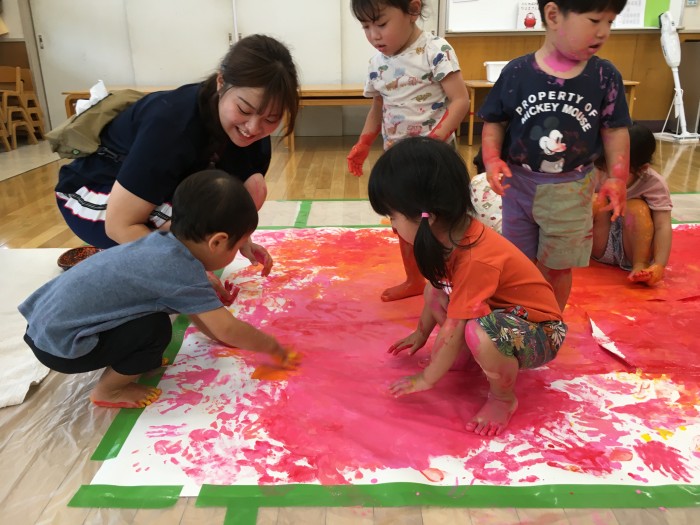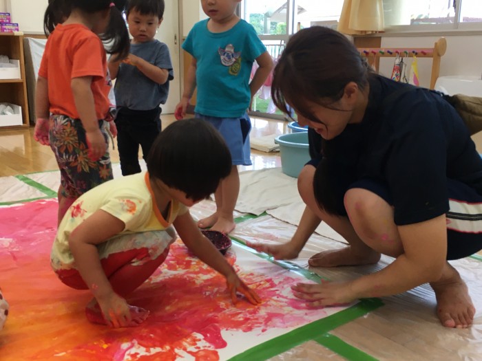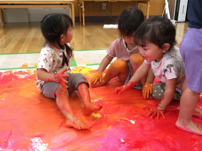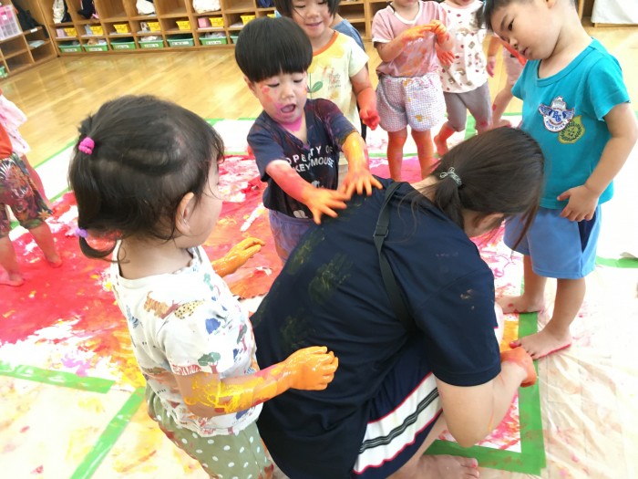 模造紙の白いところが無くなってくると、手や足に絵の具をたくさん塗ったり、みんなで先生の手足や服に絵の具を塗って、ペタペタする感触を思いきり楽しみました。