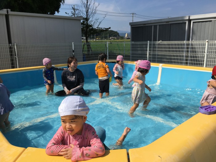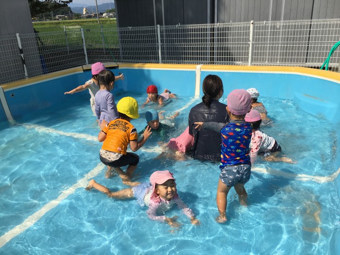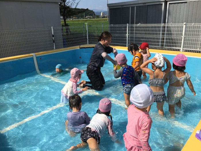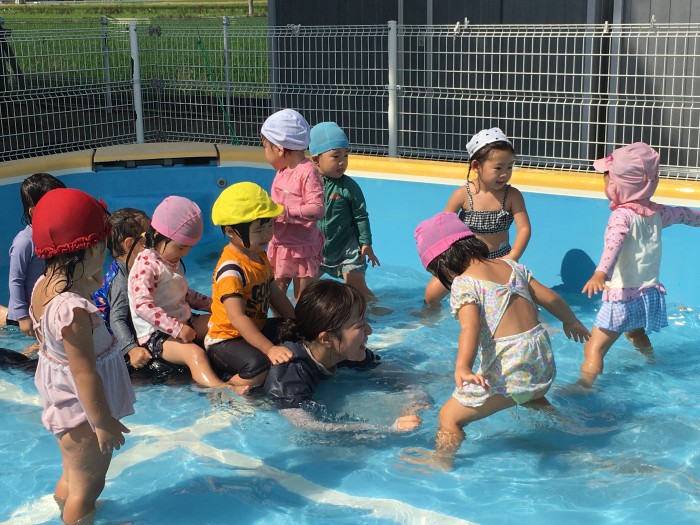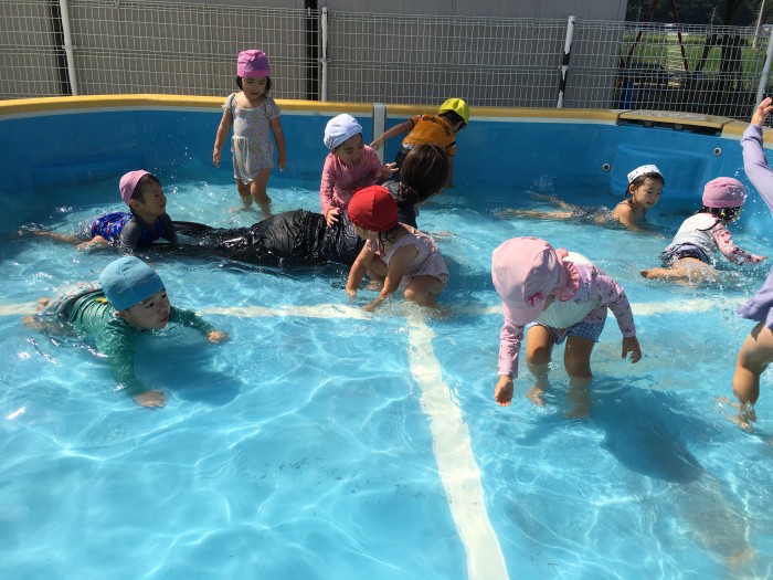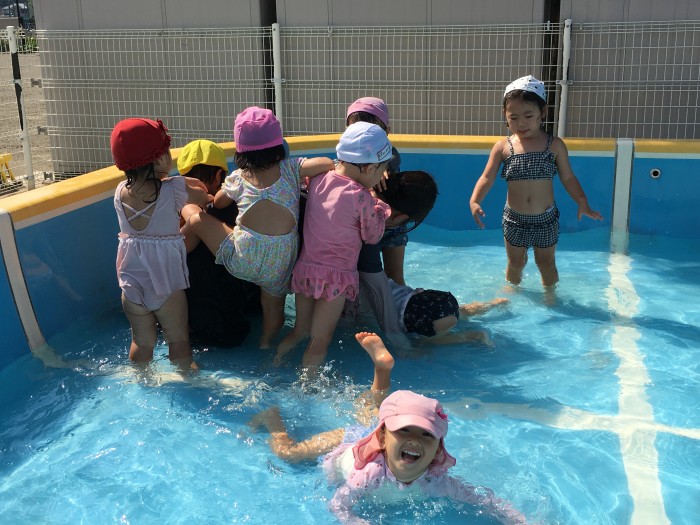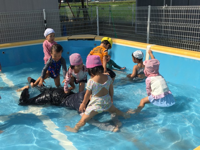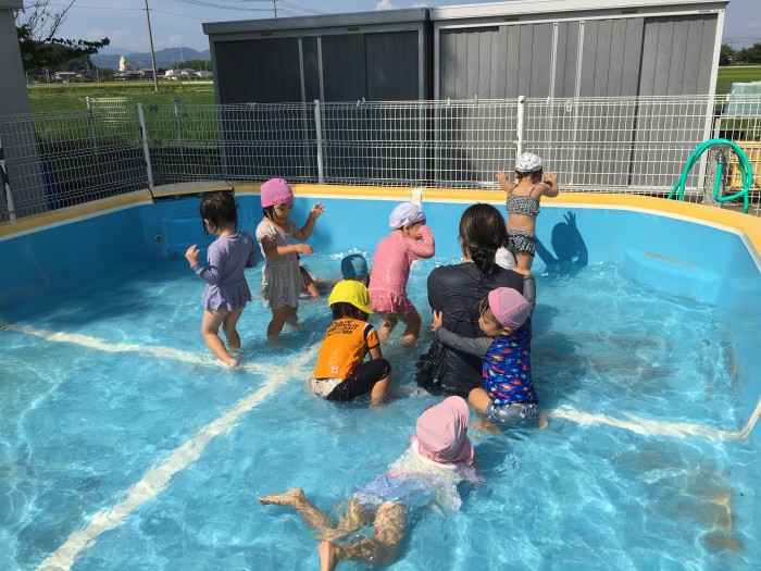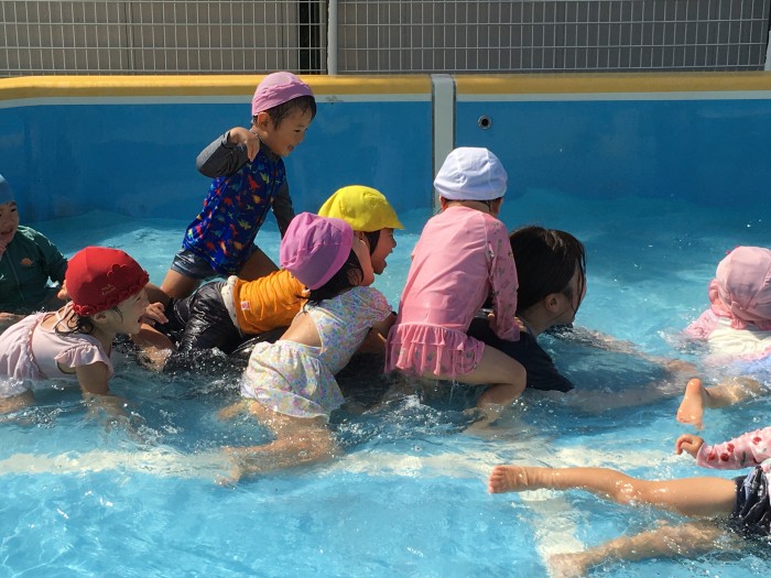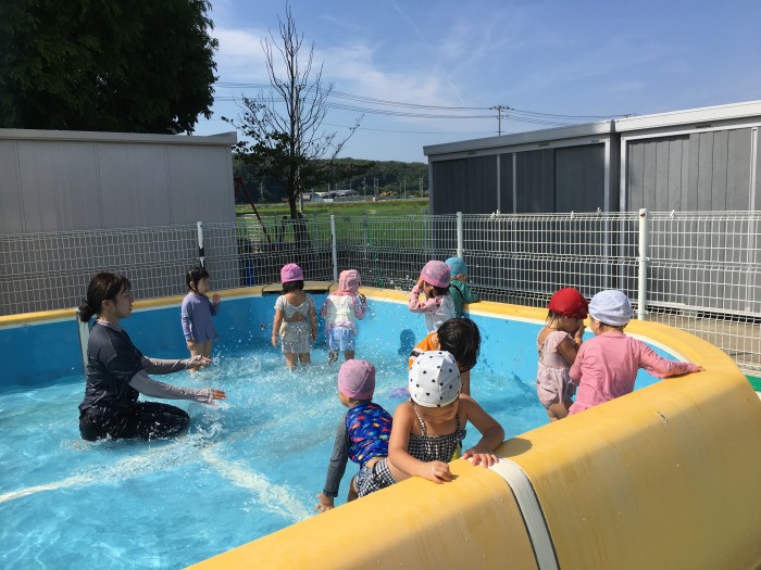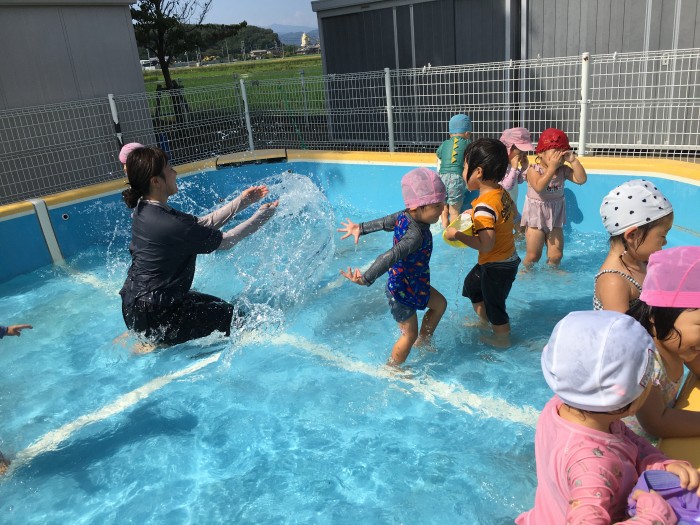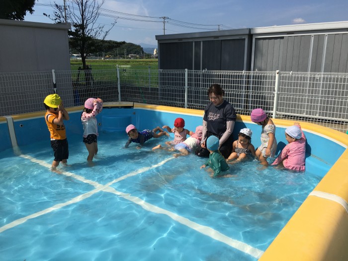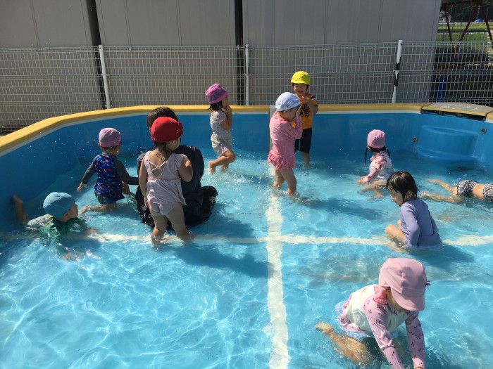 暑い日が続いていますが、プールで元気いっぱい、先生・お友達とたくさんお水をかけあいっこしてニコニコで遊んでいます。