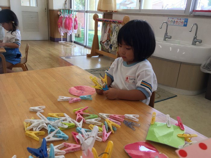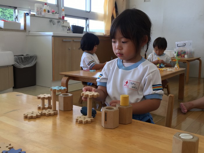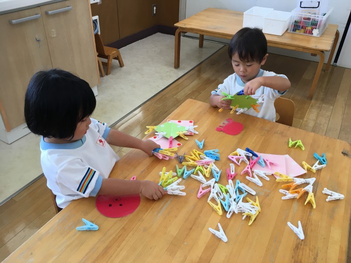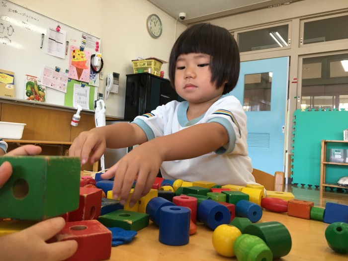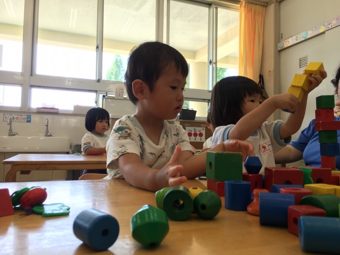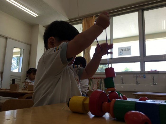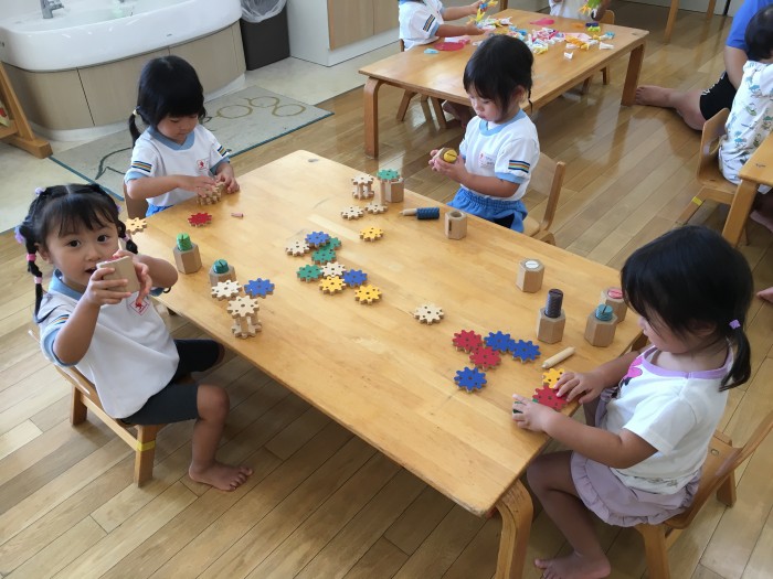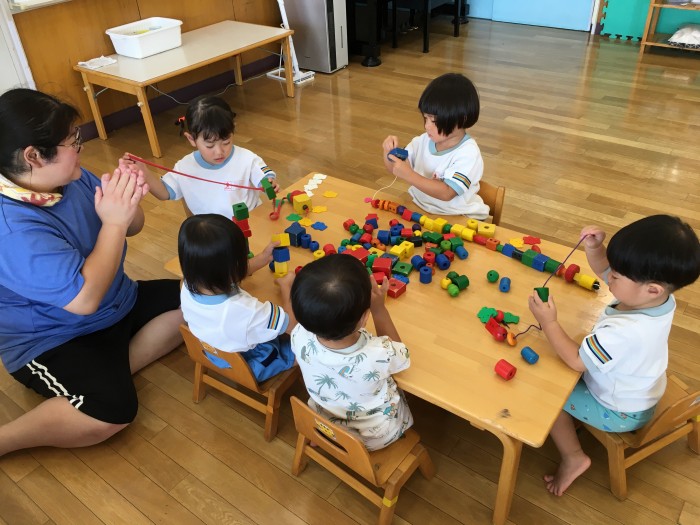 微細遊びでは、自分のやりたい遊びがある机に自分で椅子をもって行って遊びました。