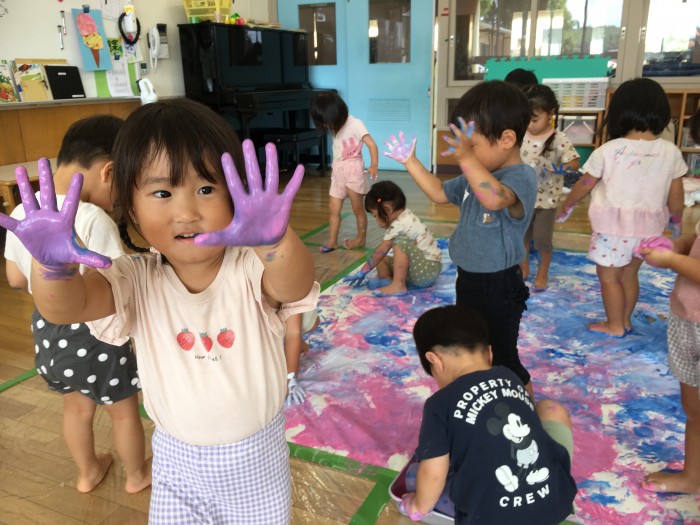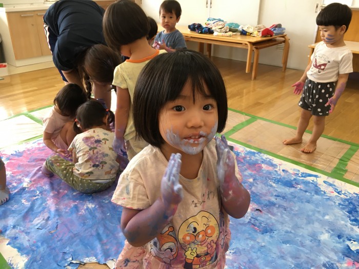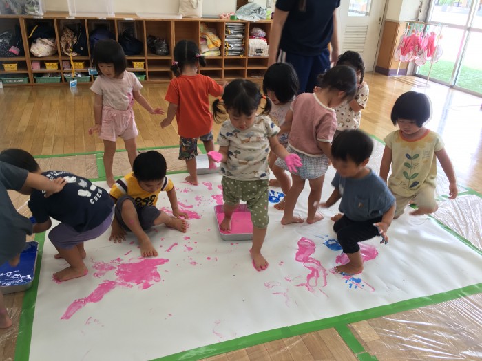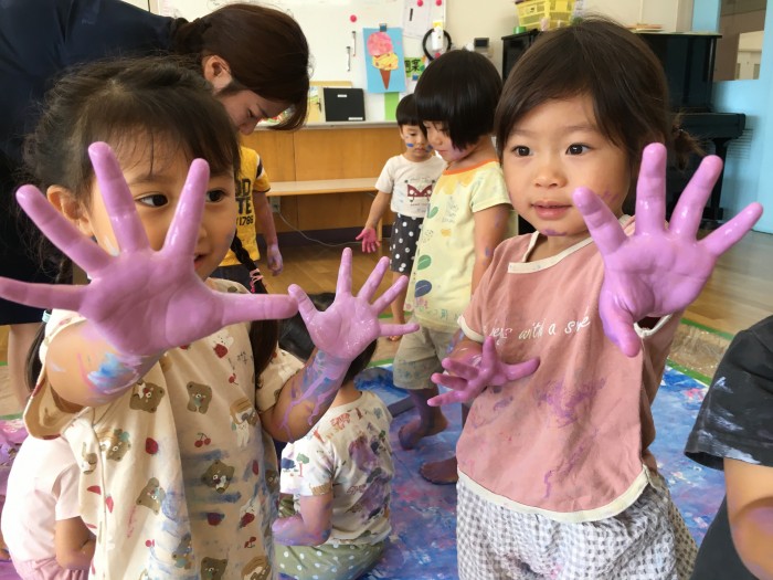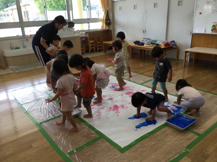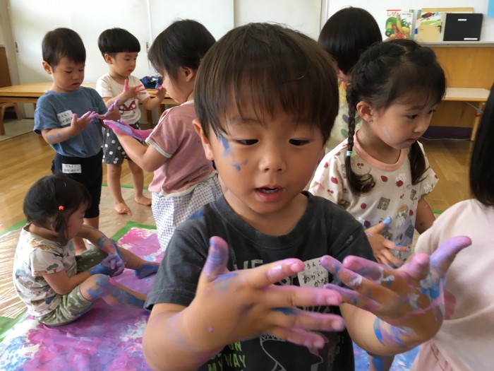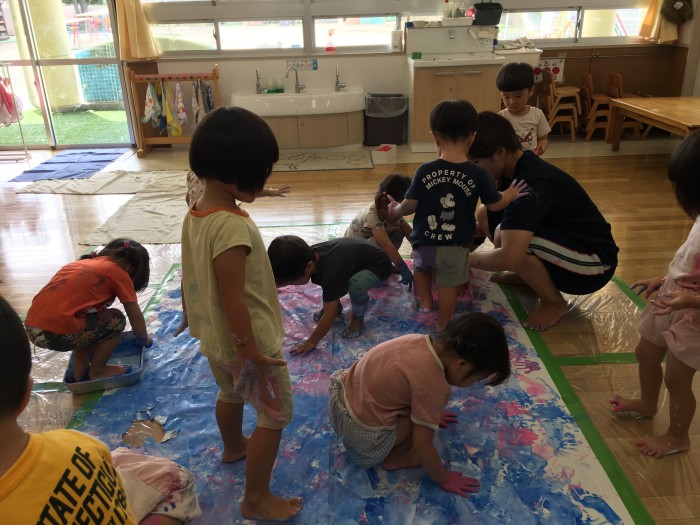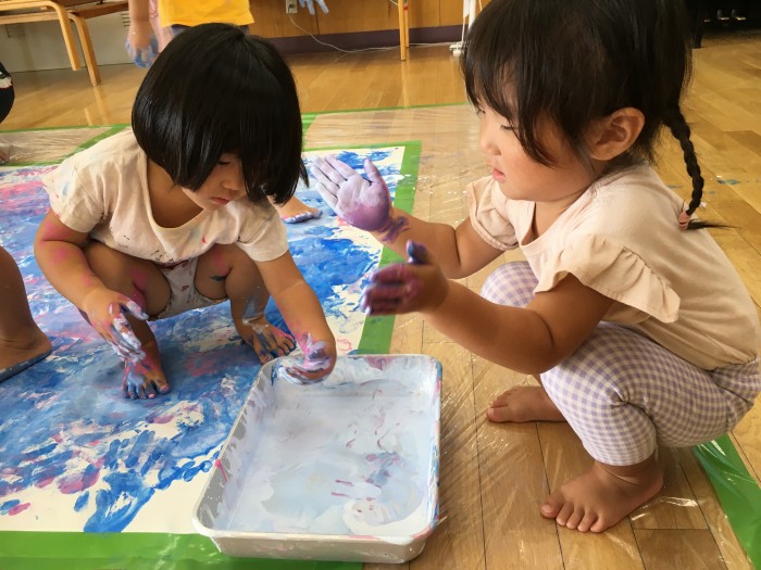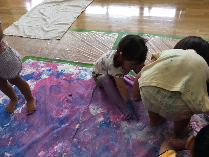 大きな模造紙に青・ピンク・白の絵具でフィンガーペイントをして遊びました。