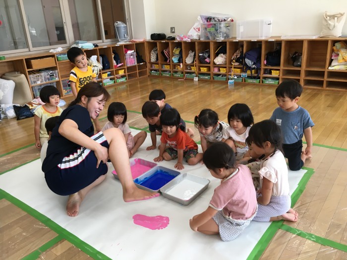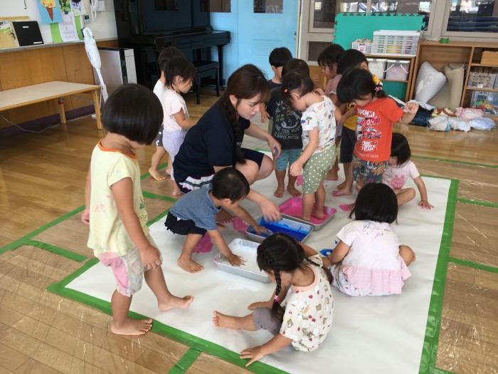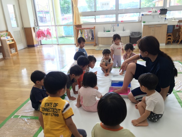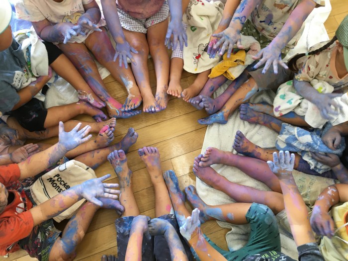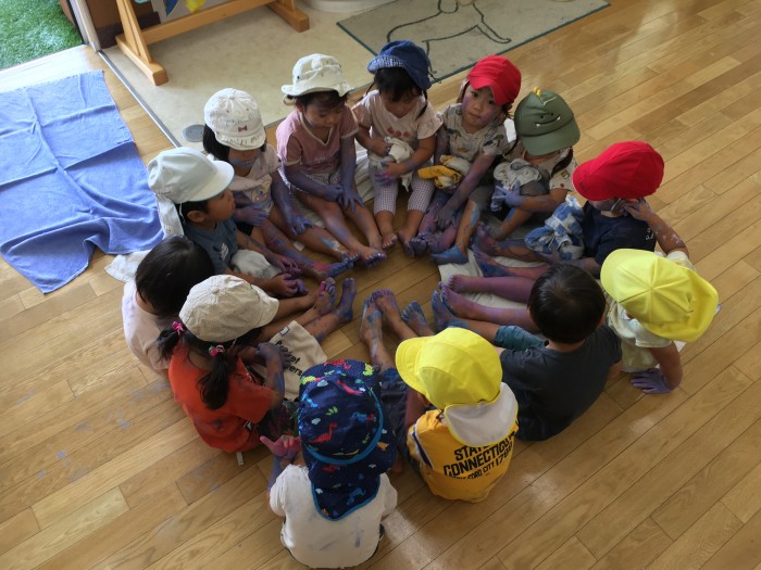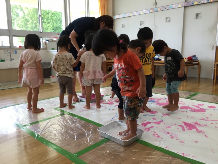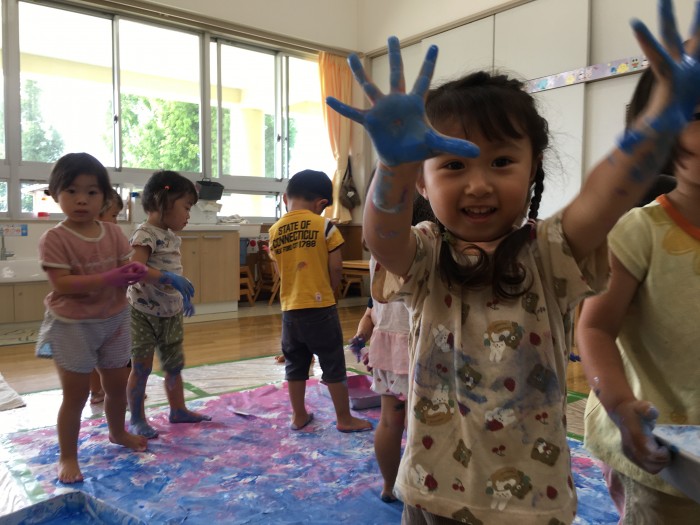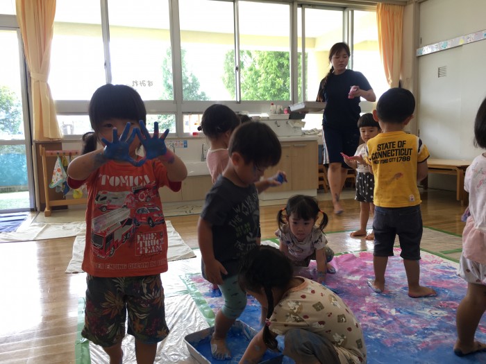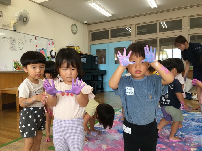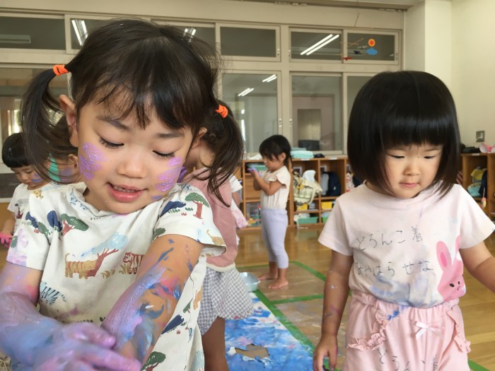 大きな模造紙に青・ピンク・白の絵具でフィンガーペイントをして遊びました。