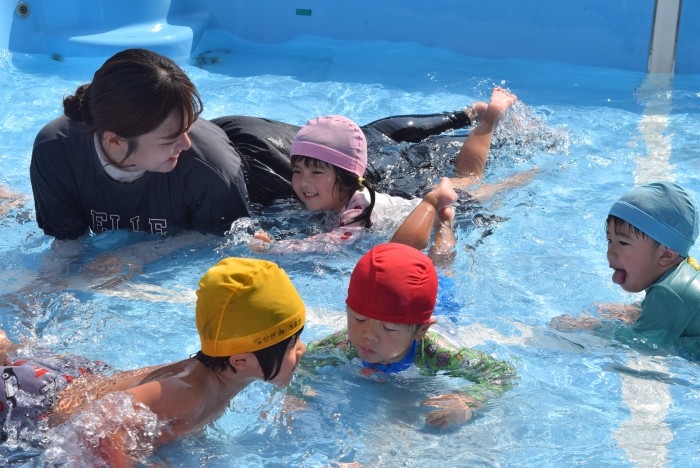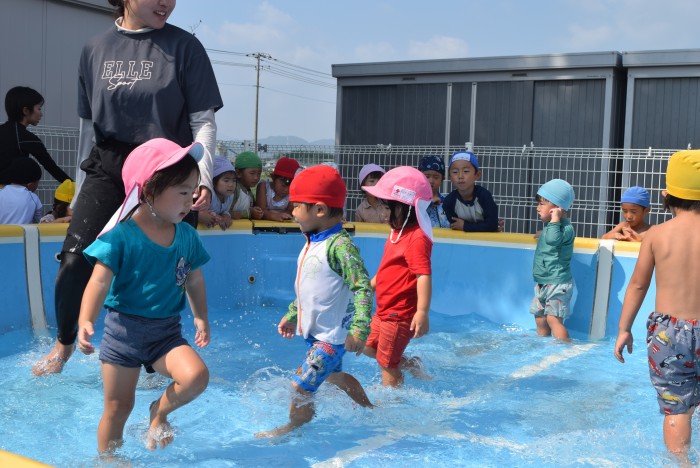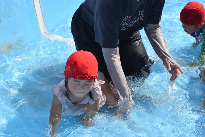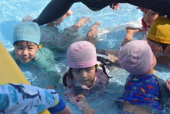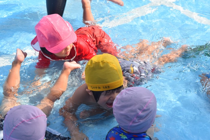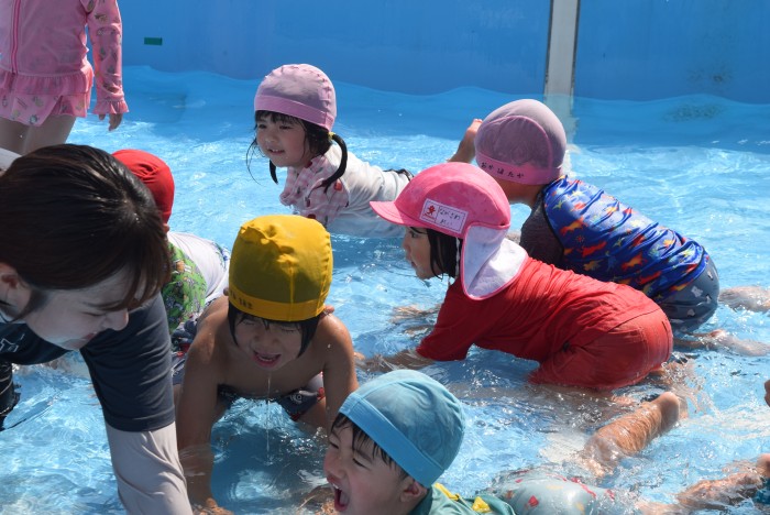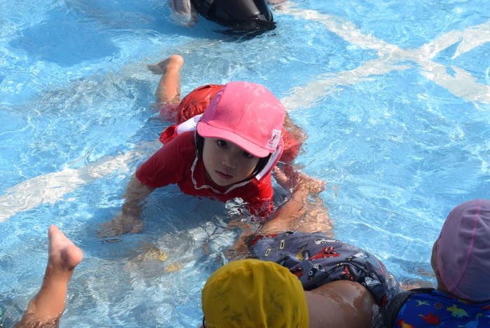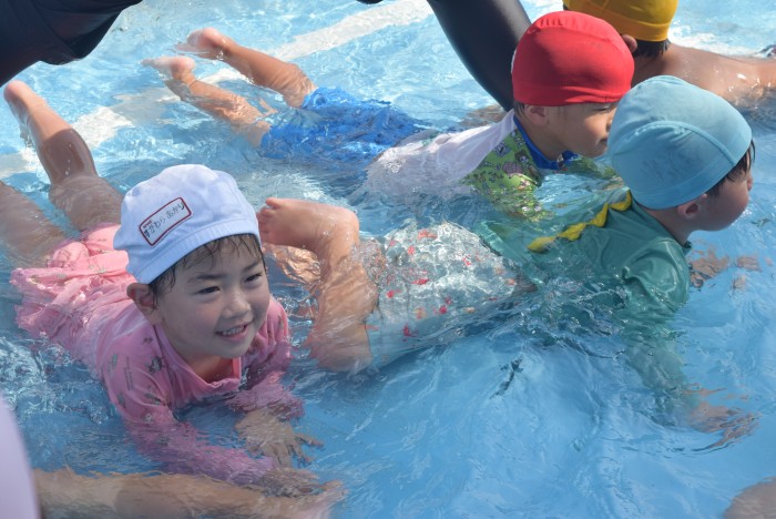 歩いたりワニさん歩きをしたり、先生の足の間のトンネルをくぐったり、お顔に水がかかっても誰1人泣くことなく、豪快に楽しんで遊びました。