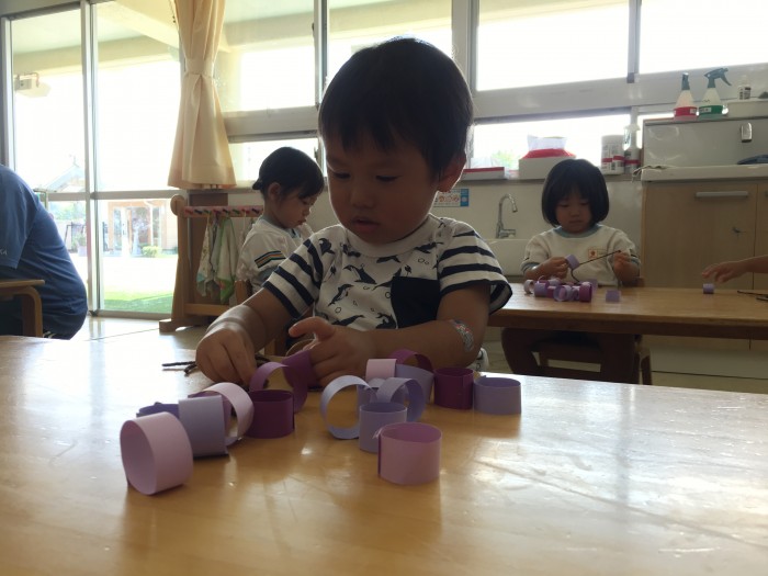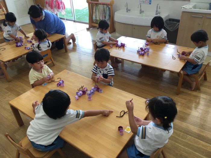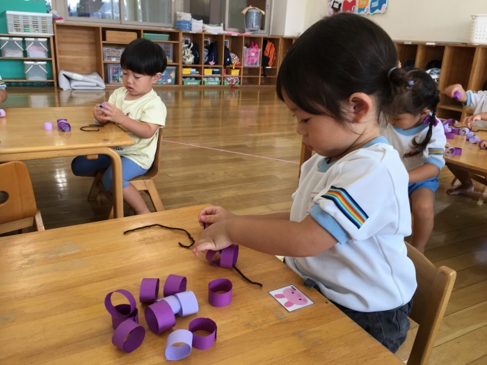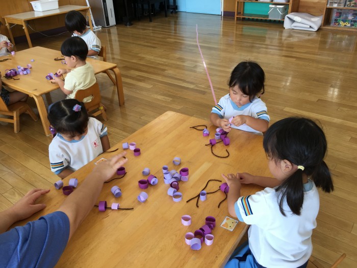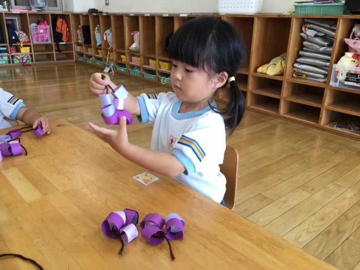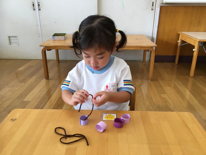 始めは「できない!」「むずかしい!」と、毛糸を輪に通すことに苦戦している子ども達でしたが、先生と一緒に通して「できた!」の経験をすると、コツを掴んで、とても手元に集中して取り組んでいました。