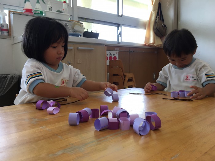 紫色の画用紙の輪っかに毛糸を通して、ぶどうを作りました。