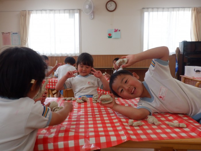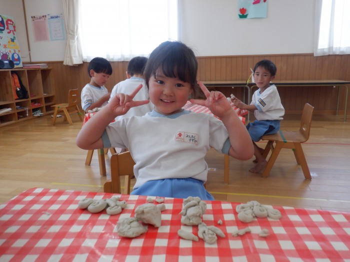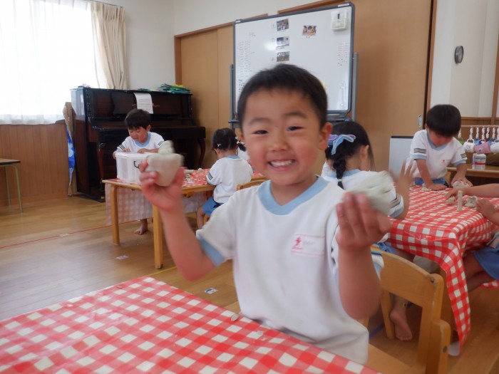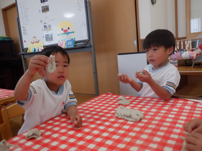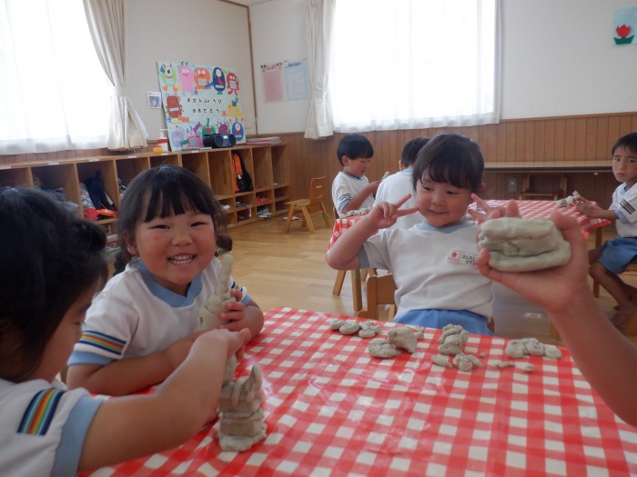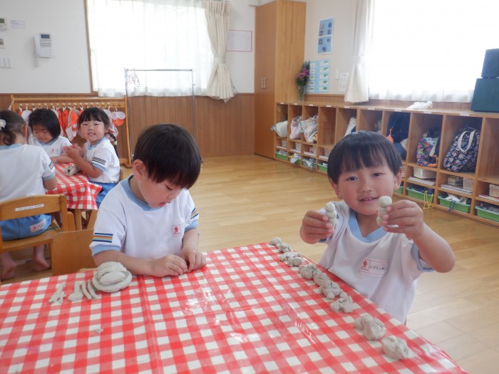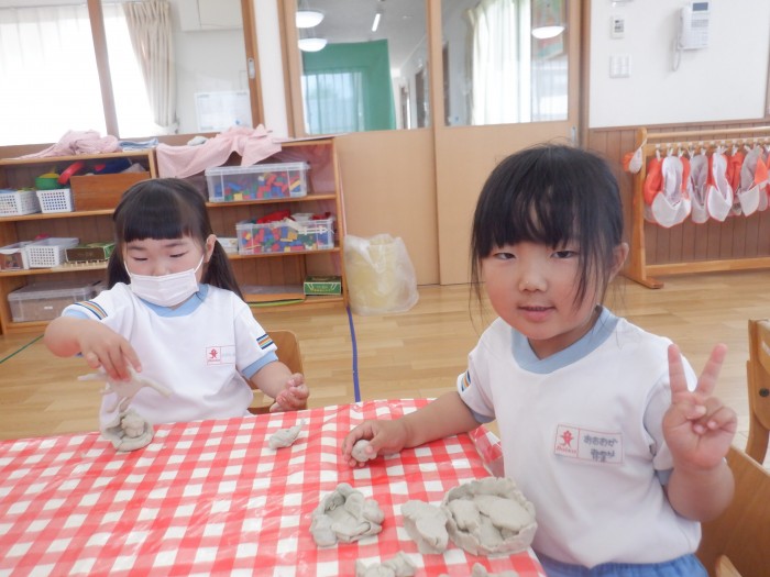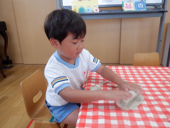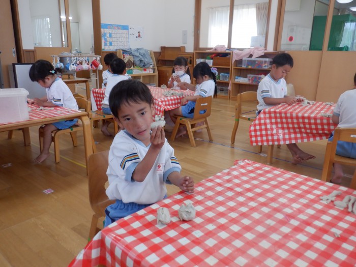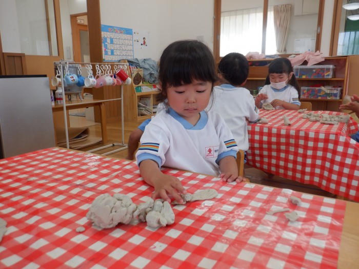 粘土遊びが大好きなゆり組さん。自分の好きな乗り物や食べ物を自由に表現しています。