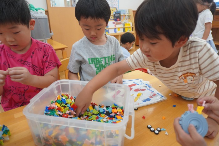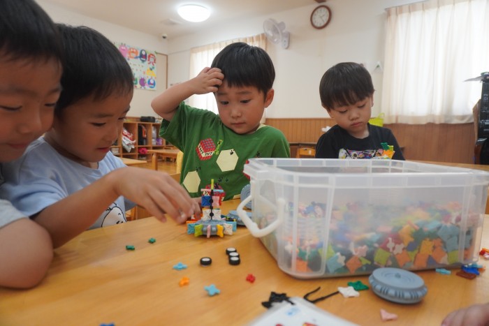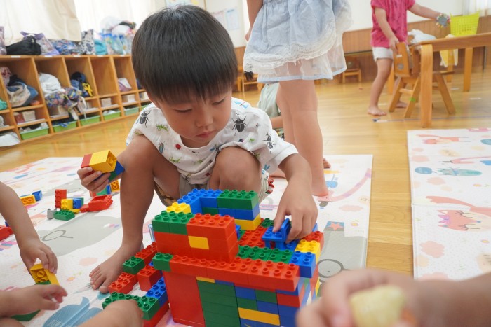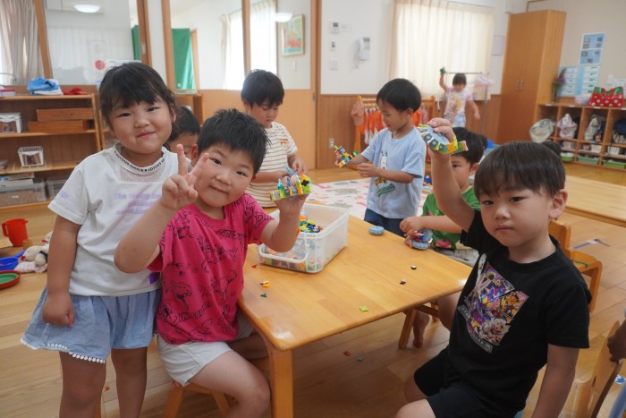 ゆり組さんではブロック・ラキュー・おままごとがブームになっており、それぞれのおもちゃでみんなが楽しく遊んでいます。