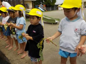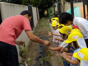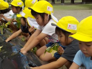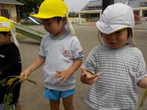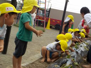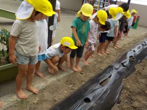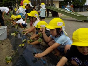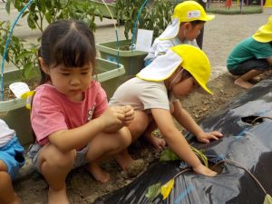 さつまいもの種を植えました。ひとり1本種を持ち、土を一生懸命掘って優しく丁寧に植えることができました。