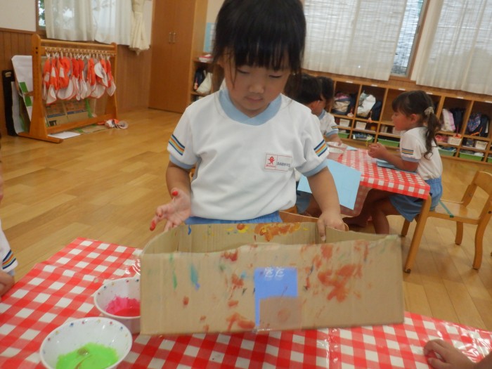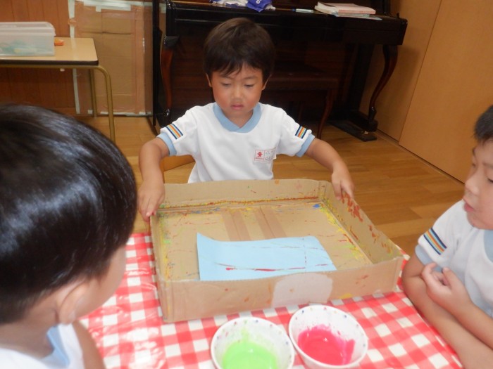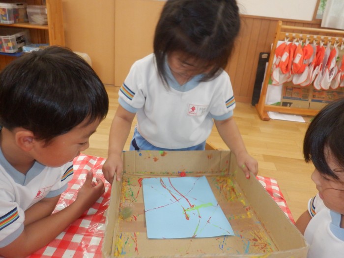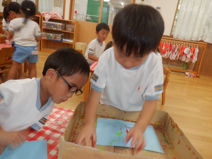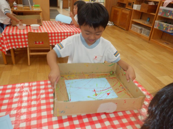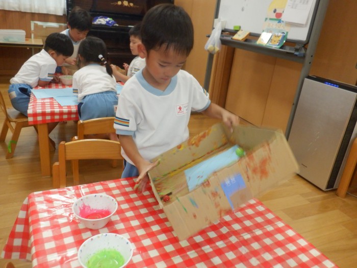 今回はかかしのお洋服づくりです。スーパーボールを使って転がし絵にしました。