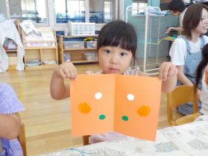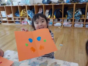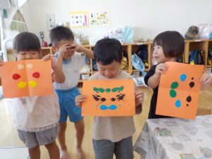 好きな絵の具を画用紙につけて半分に折り、模様を付けました。