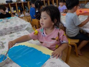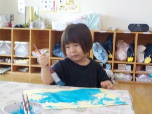 もう一つは画用紙に水色の絵の具を塗りました。筆で上手に塗ることが出来ました。