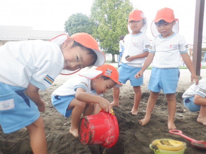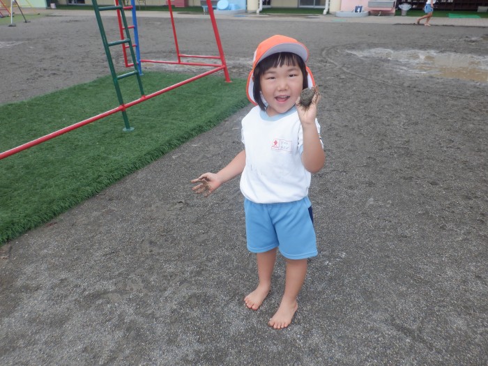 前日雨が降っていい土を見つけたお友だち。泥だんごを作って見せてくれました。