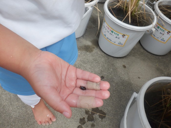 稲の観察をしているのかな…?と近づくと、バケツ稲の中にいたおたまじゃくしを見つけていました。