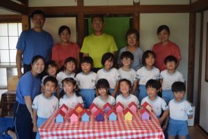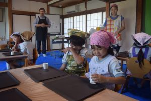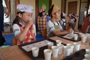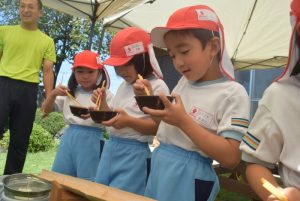 出汁を飲むと「なんの味だろう…」「分かった!」と、一生懸命考えたり、答えが分かると嬉しそうに紙コップをシートの上に置いたりしました。正解が発表されると「やったー!」と、喜んでいた子どもたちでした。出汁の味が苦手なお友だちもいましたが、楽しく参加することが出来ました。