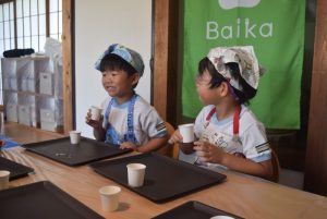 エプロンに着替えて、紙コップに入った出汁を実際に飲んだり、昆布や煮干しなど実際に手にとって匂いを嗅いだりしました。