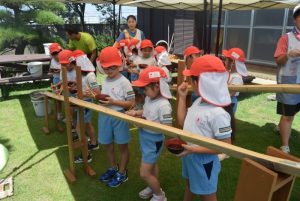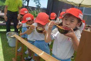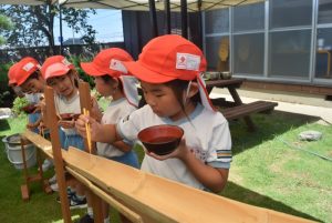 出汁比べの後は、子どもたちが一番楽しみにしていた流しそうめん体験をお外で行いました!!