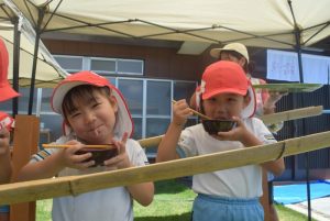 上から流れてくるそうめんや、きゅうりなどに大興奮な子どもたちでした!!