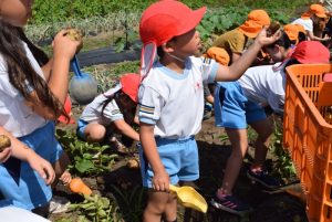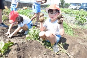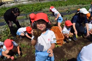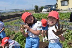 お友だちや先生と、「うんとこしょ どっこいしょ」と、力を合わせて根っこを引っ張ったり、シャベルや手をたくさん使って土を掘り、ジャガイモをたくさん採ることが出来、「大きい!!」と、みんな目を輝かせていました!