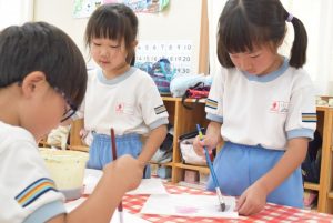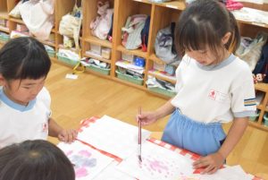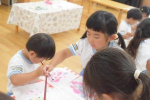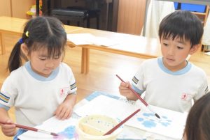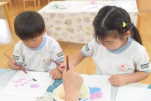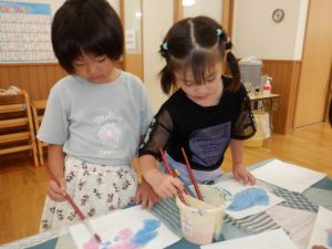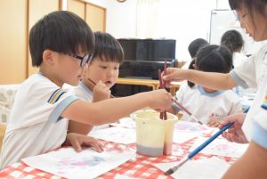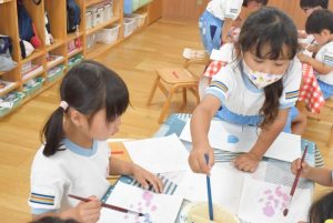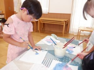 絵の具で、たらし絵を行い、雨に見立てたり、キッチンペーパーの少しザラザラした素材を使用してアジサイに色を付けたりして楽しみました。色がつくと「かわいい!」「色が混ざった!」と、お友だちと仲良くお話していました。
